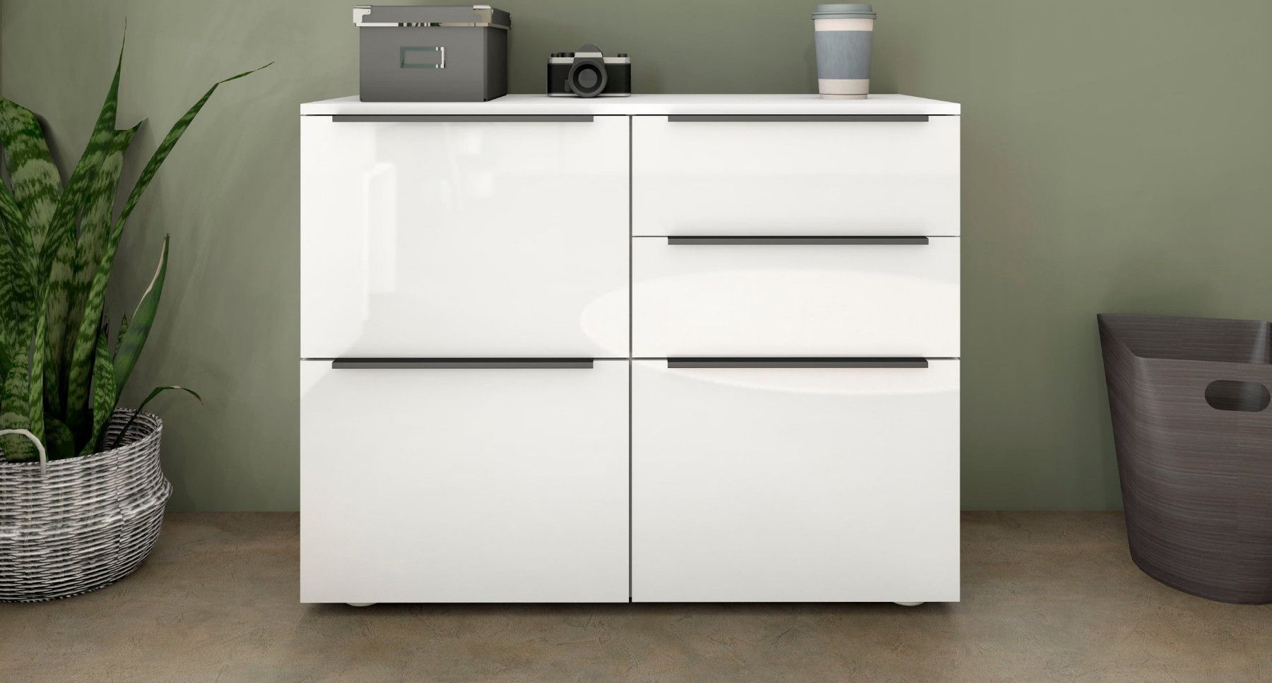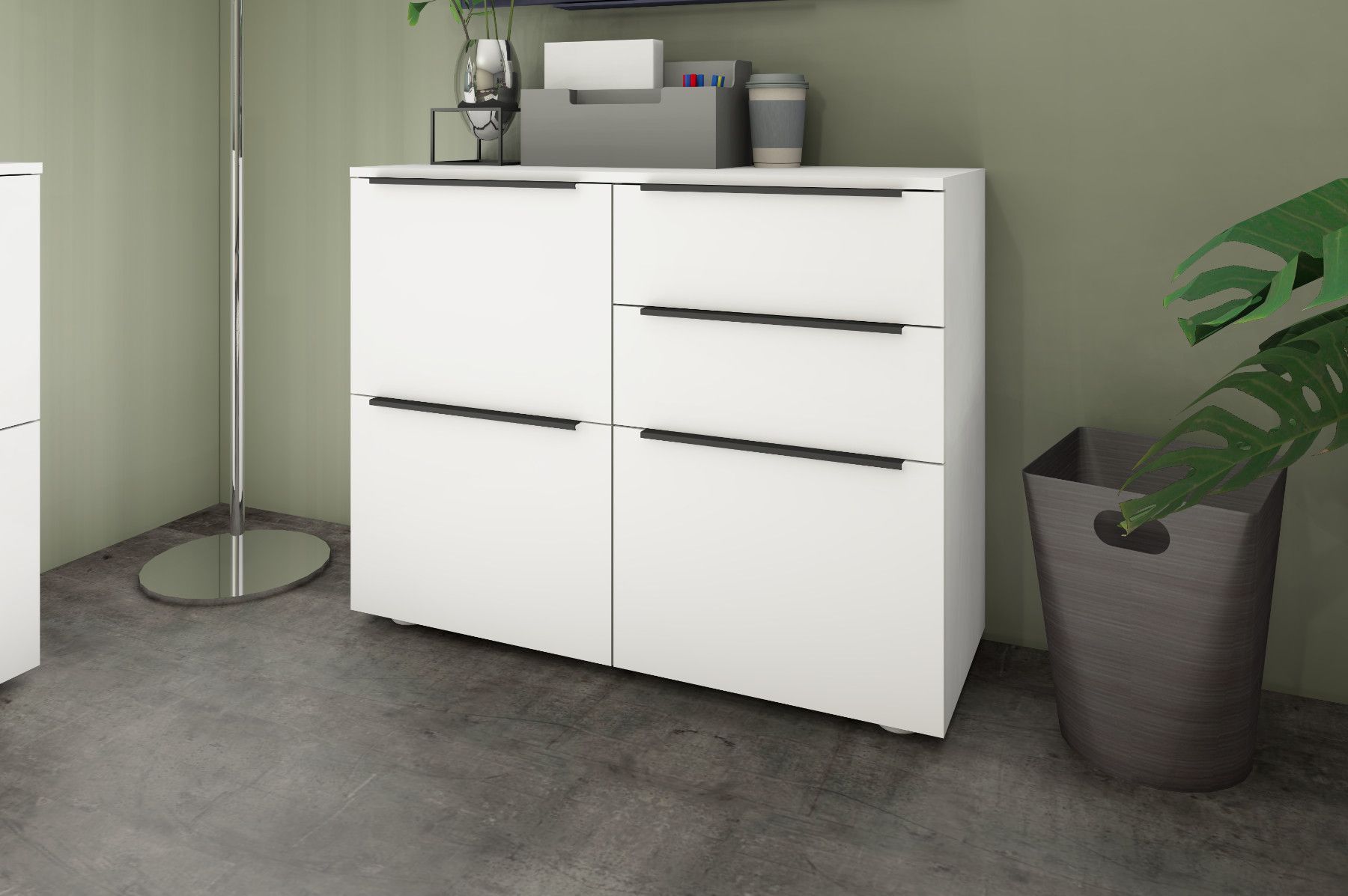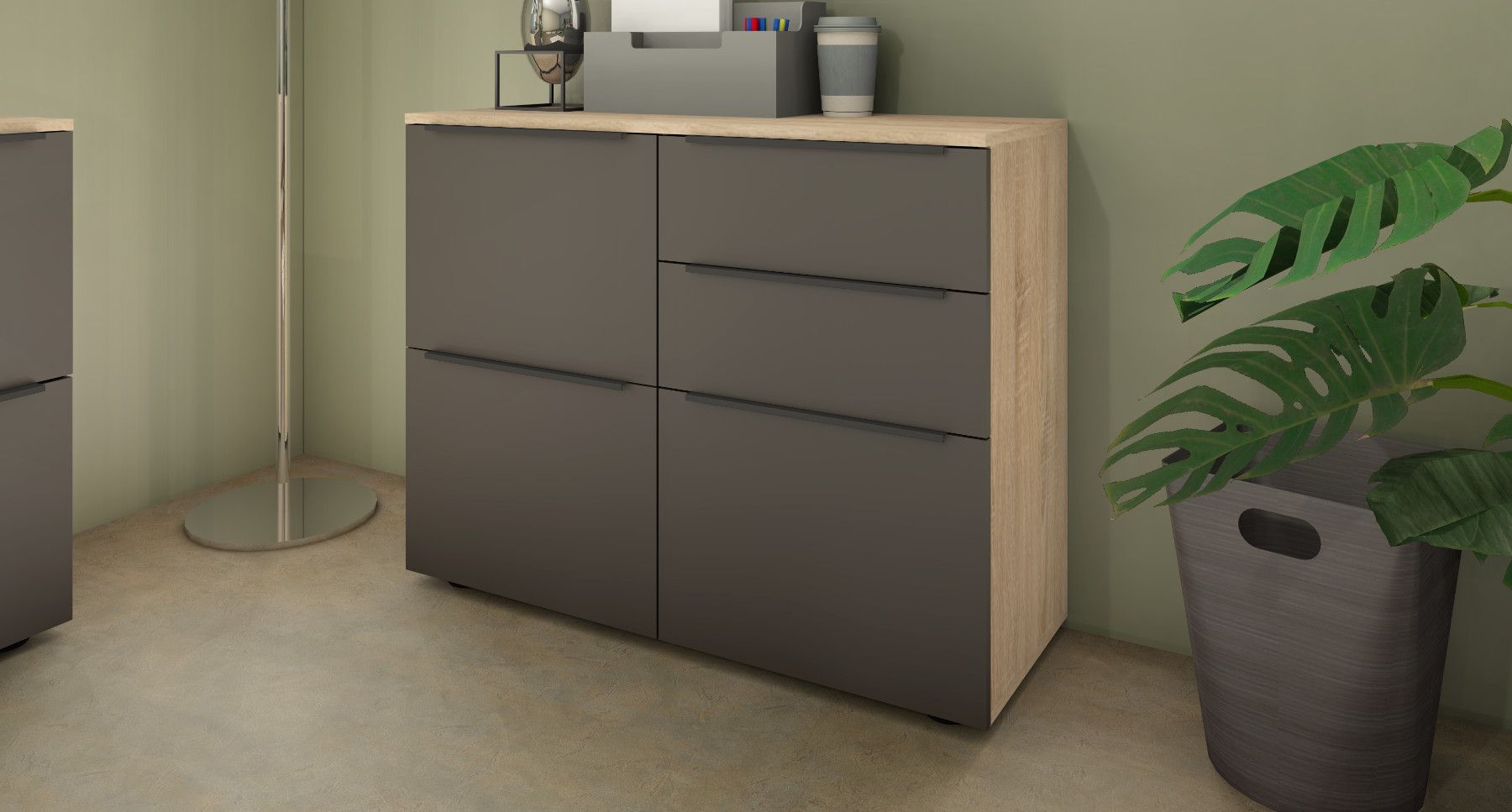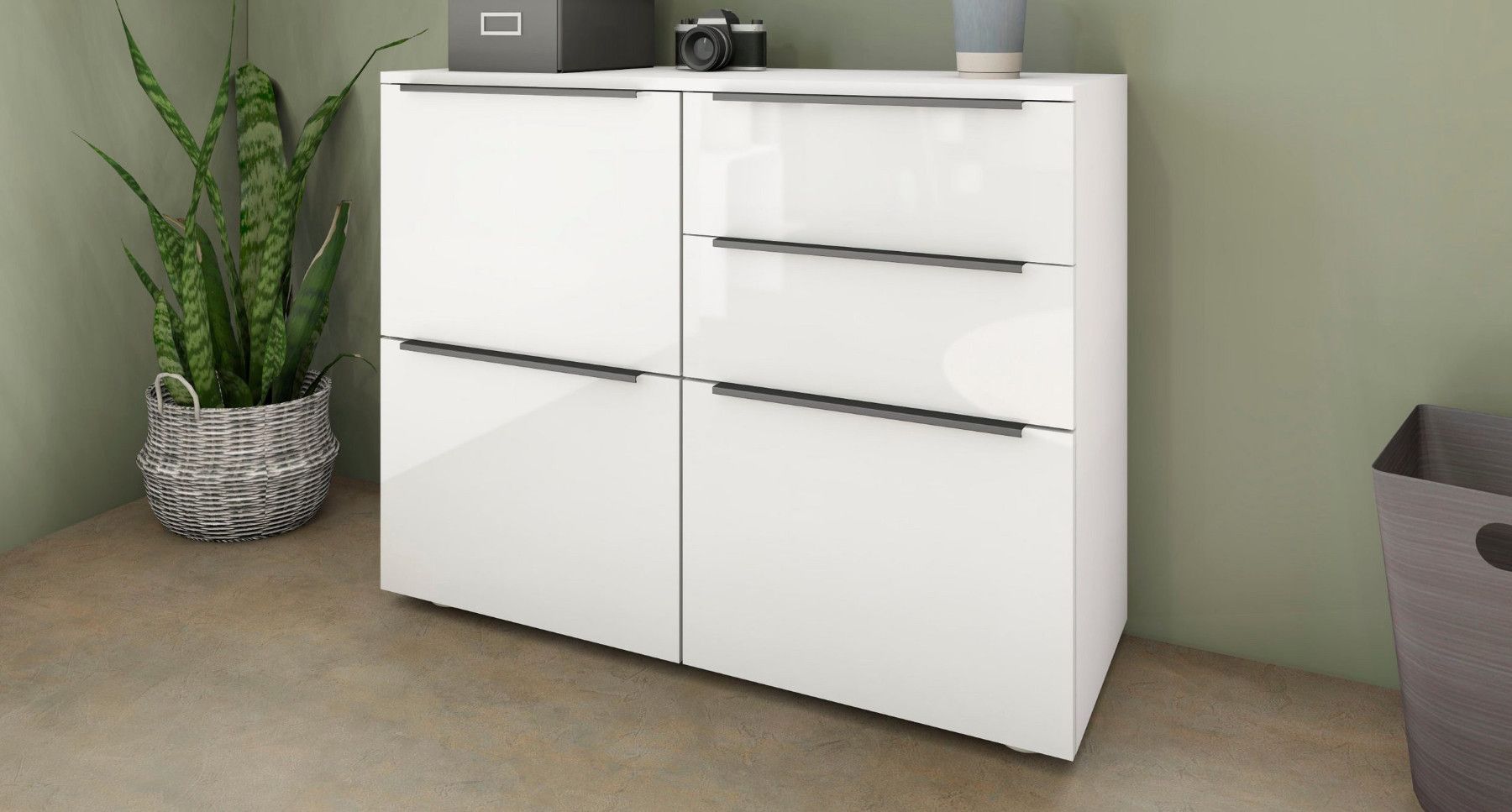 Das Wichtigste auf einen Blick 3 Türen 2 Schubkästen Aluminiumprofilgriffe (Anthrazit) Scharniere aus Metall Schubkästen auf Kugelführungen 2 verstellbare Einlegeböden verschiedene Trendfarben Pflegeleichte Oberfläche Made in Germany Material & Maße Maße (B T H) Gesamtmaße: 93 35 72 cm Material