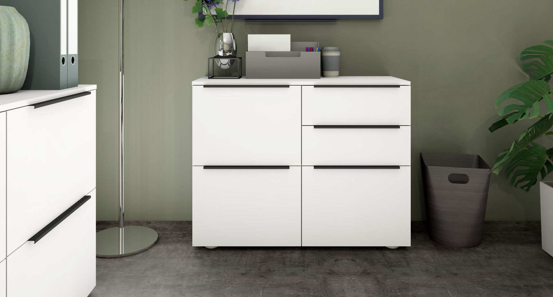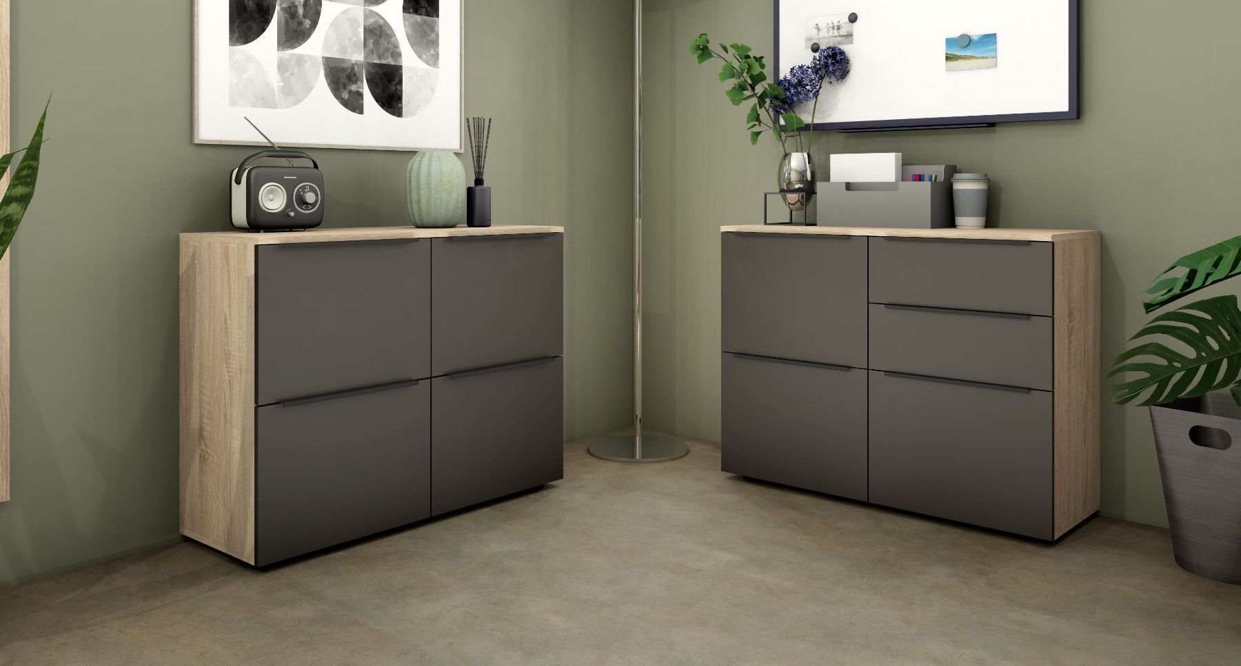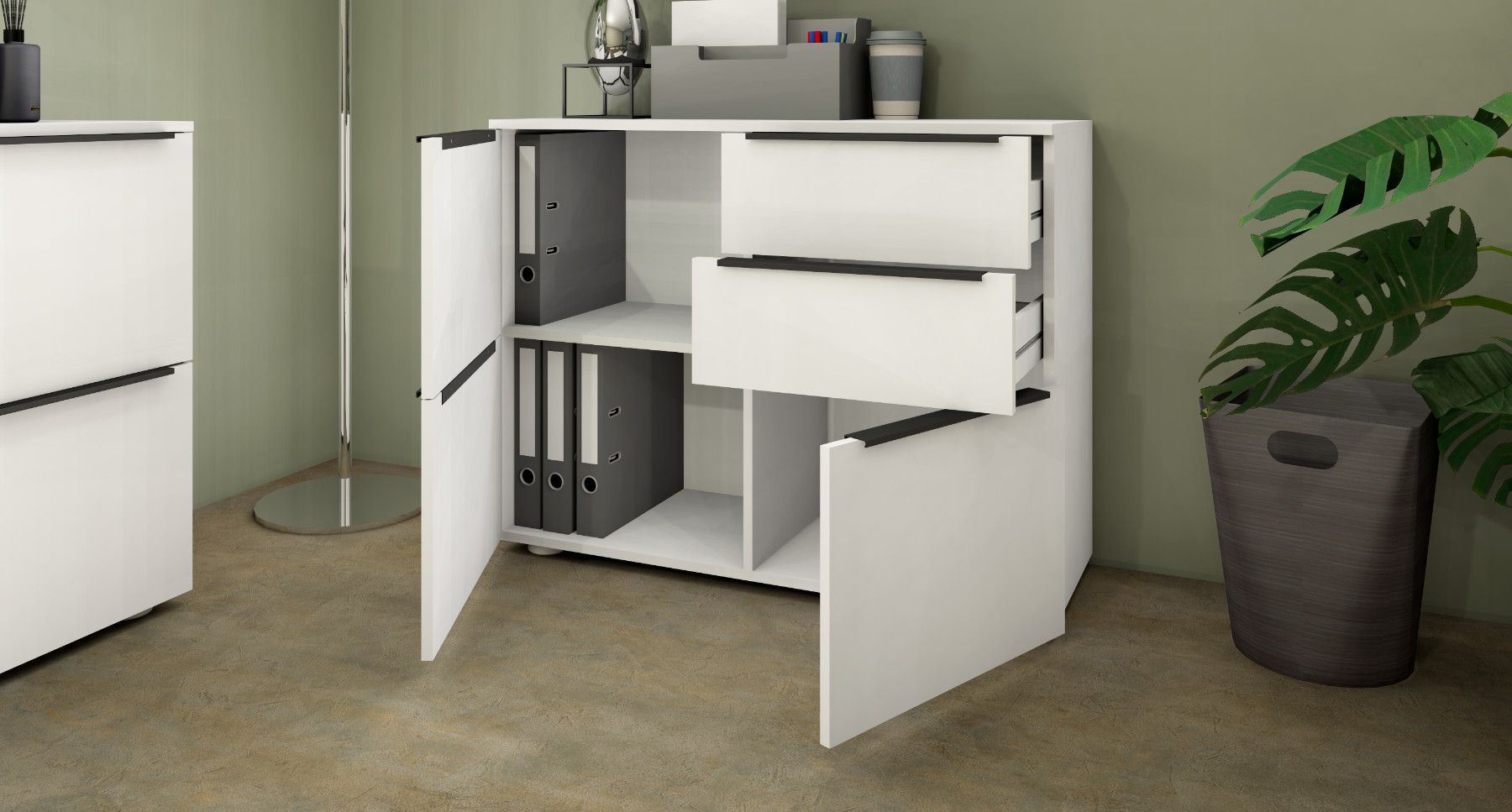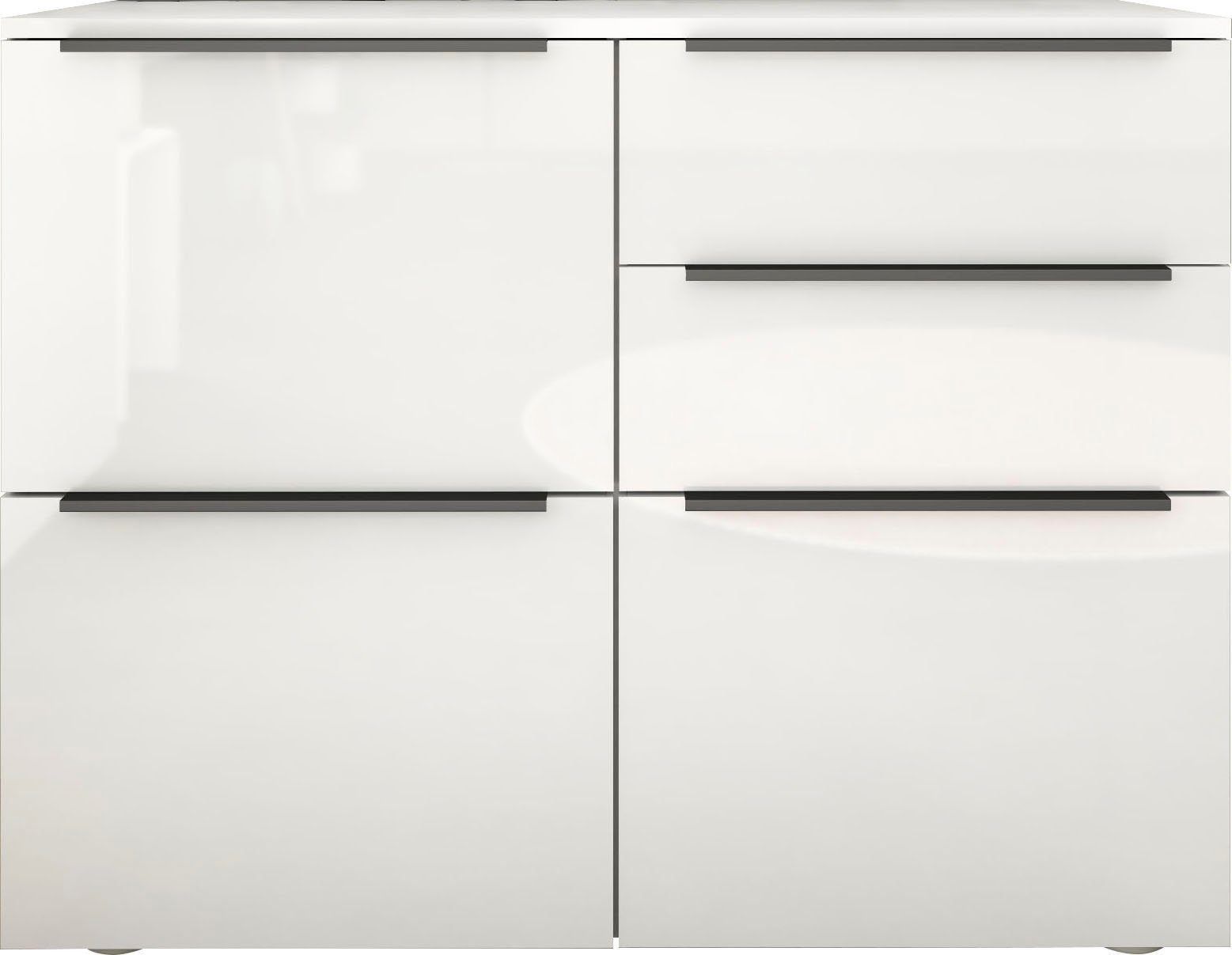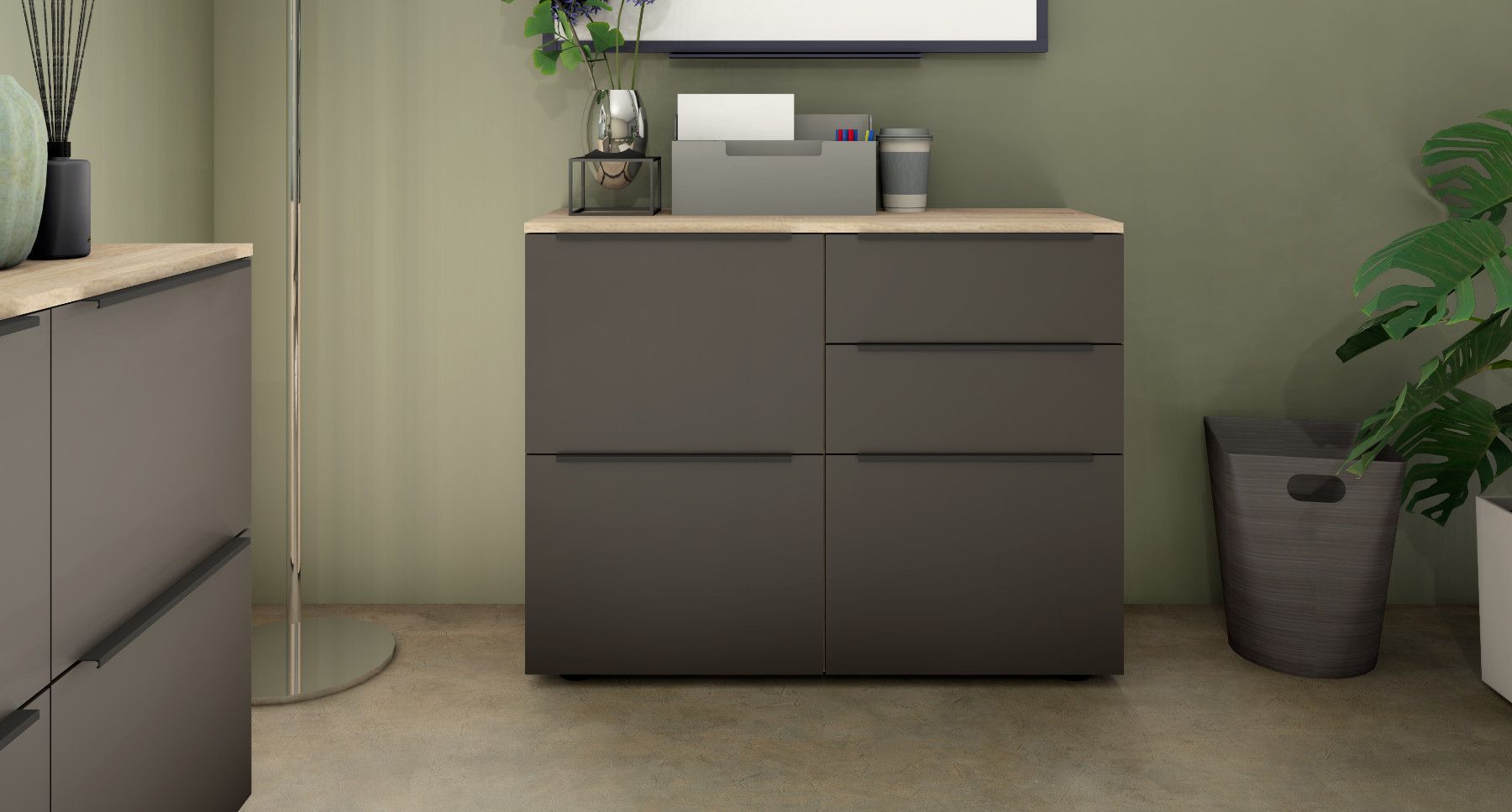 Das Wichtigste auf einen Blick 3 Türen 2 Schubkästen Aluminiumprofilgriffe (Anthrazit) Scharniere aus Metall Schubkästen auf Kugelführungen 2 verstellbare Einlegeböden verschiedene Trendfarben Pflegeleichte Oberfläche Made in Germany Material & Maße Maße (B T H) Gesamtmaße: 93 35 72 cm Material