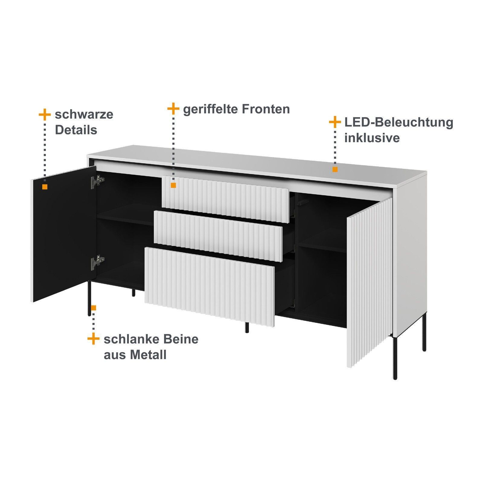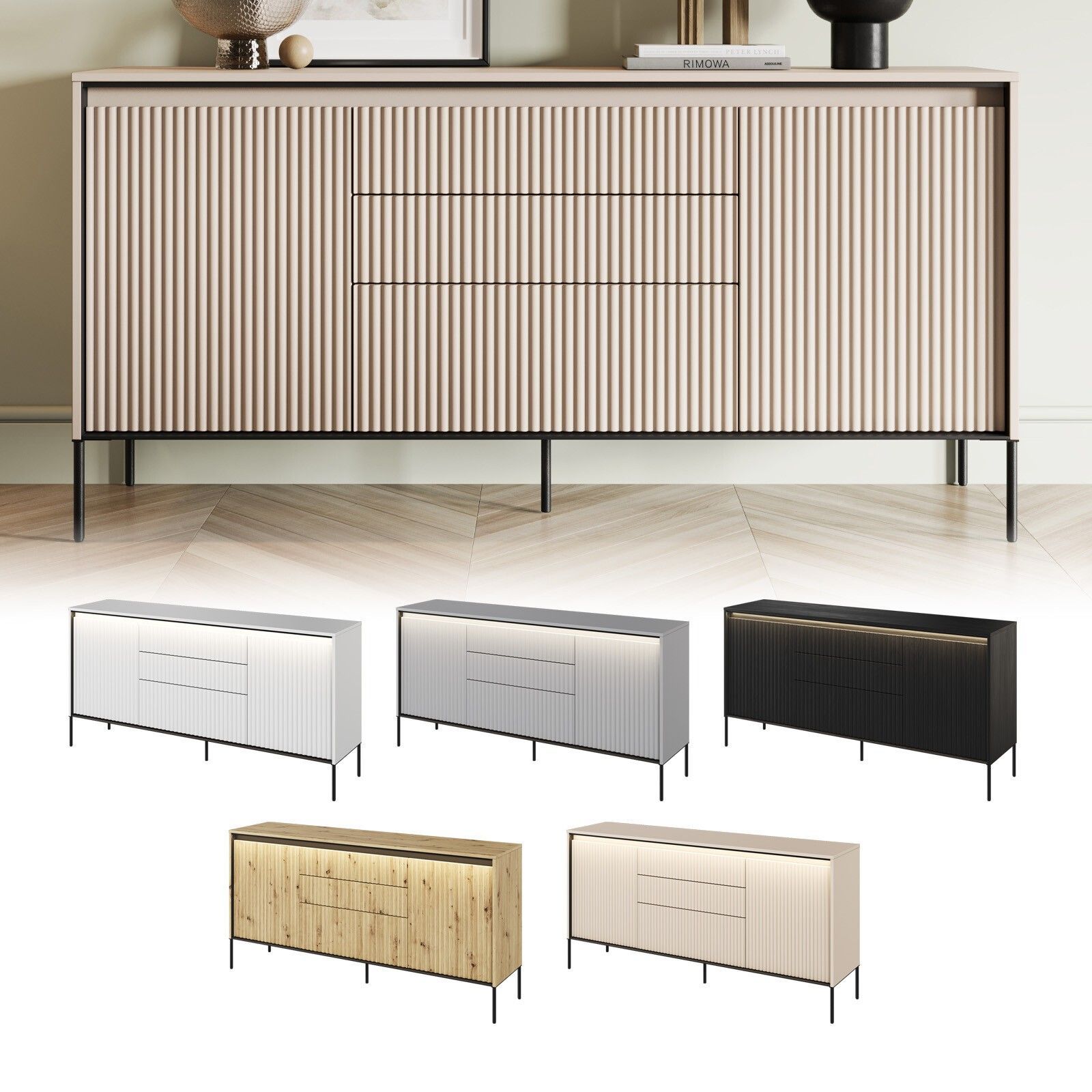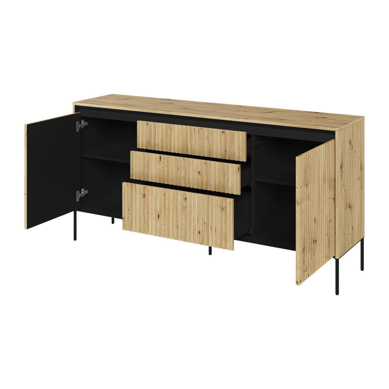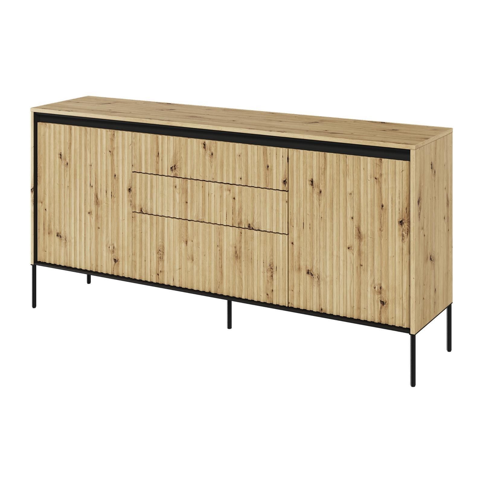 Kommode TREND TR-01 Sideboard Schrank Anrichte Highboard Mehrzweckschrank Die TREND Möbelkollektion vereint zeitgenössischen Stil und Funktionalität. Das charakteristische Merkmal sind die geriffelten Fronten, die den Möbeln ein raffiniertes und einzigartiges Aussehen verleihen. Die schlanken Metall