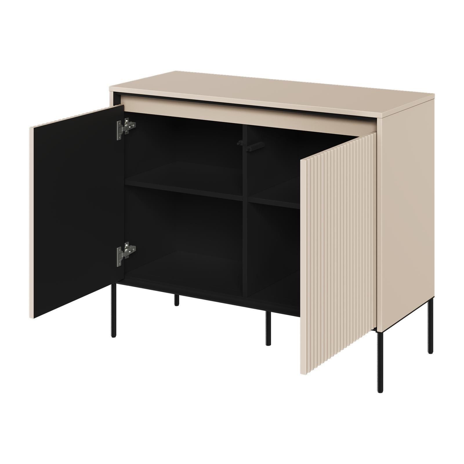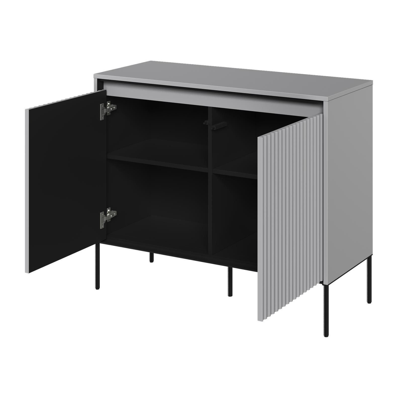 Kommode TREND TR-02 Sideboard Schrank Anrichte Highboard Mehrzweckschrank Die TREND Möbelkollektion vereint zeitgenössischen Stil und Funktionalität. Das charakteristische Merkmal sind die geriffelten Fronten, die den Möbeln ein raffiniertes und einzigartiges Aussehen verleihen. Die schlanken Metall