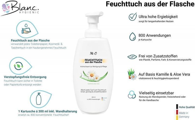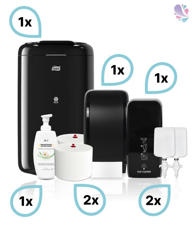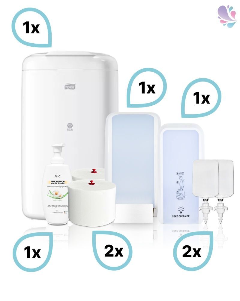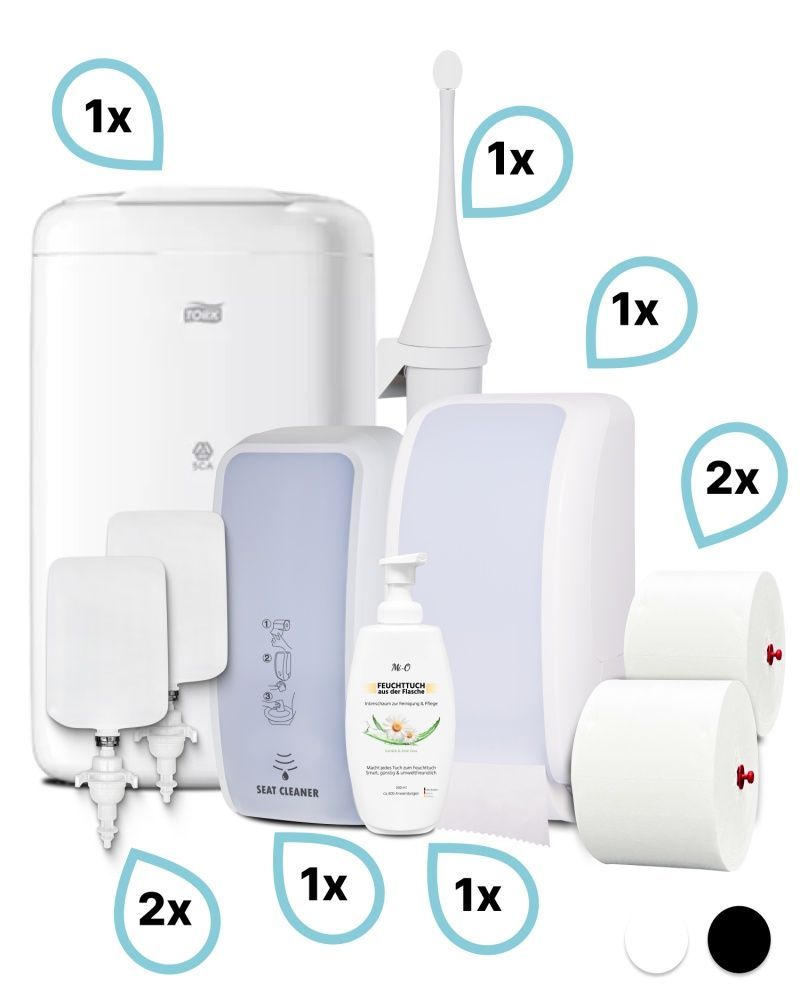 Komplett-set Damentoilette: Toilettenpapierspender + Sitzreinigung + Intimschaum + Hy