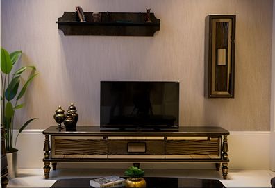 Luxuriöses TV-Sideboard mit glänzender Oberfläche und goldenen Akzenten