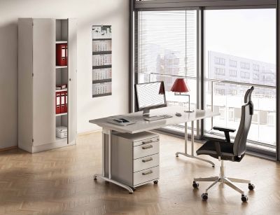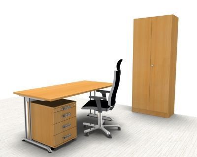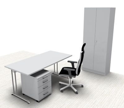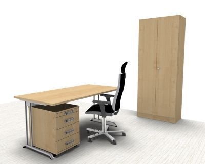 Komplettbüro B14 bestehend aus einem Schreibtisch mit C-Fuß-Gestell 160 cm, einem Rollcontainer, einem Aktenschrank 5 Ordnerhöhen und einem Drehstuhl mit Kopfstütze und Armlehnen. Dekorfarbe in Ahorn, Buche, Weiß oder Lichtgrau.