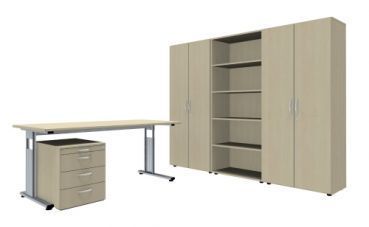 Komplettbüro GS612 Dekor: Ahorn Buche Lichtgrau oder Weiß Lieferumfang: 1 x Schreibtisch mit C-Fuß-Gestell 1600 x 800 x 680-820 mm (B x T x H) 1 x Rollcontainer 3 Schübe, Zentralverschluss 430 x 600 x 566 mm ( B x T x H) 2 x Schrank 5 Ordnerhöhen, mit Schloss 800 x 420 x 1808 mm (B x T x H) 1 x Regal 5 Ordnerhöhen 800 x 400 x 1808 mm (B x T x H)