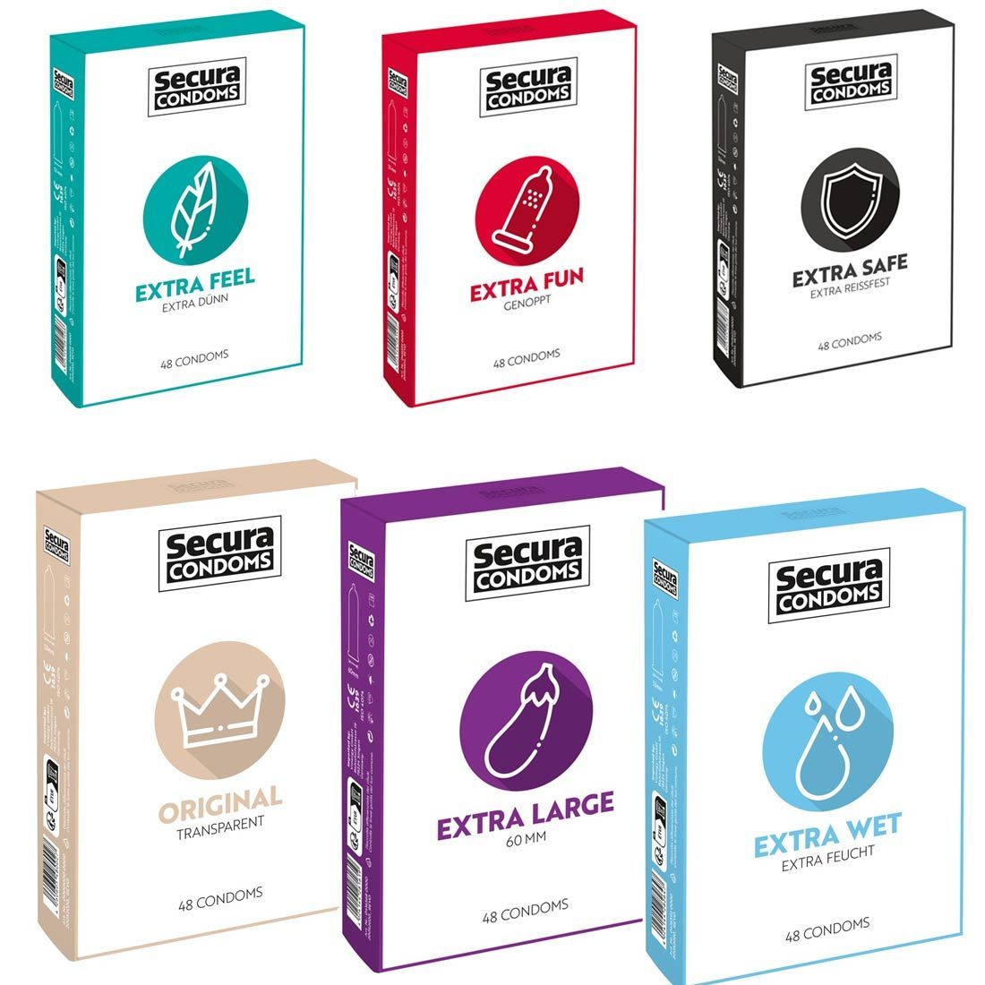 Secura Kondome 48 Stück - 6 Sorten - extra dünn dick Anal feucht Noppen Original Secura