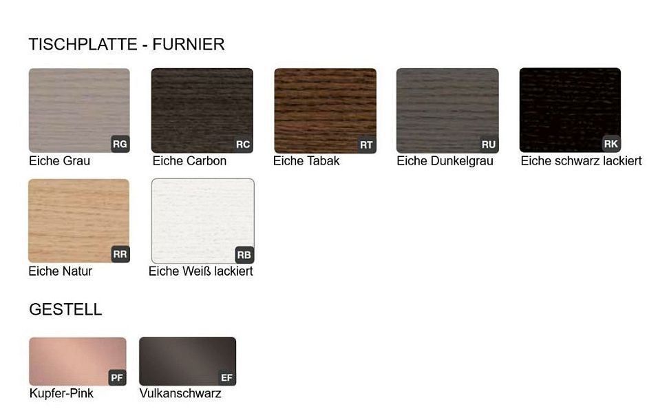 Eiche Weiß lackiert (RB), Eiche Natur (RR), Eiche Grau (RG), Eiche Dunkelgrau (RU), Eiche Carbon (RC), Eiche Tabak (RT)