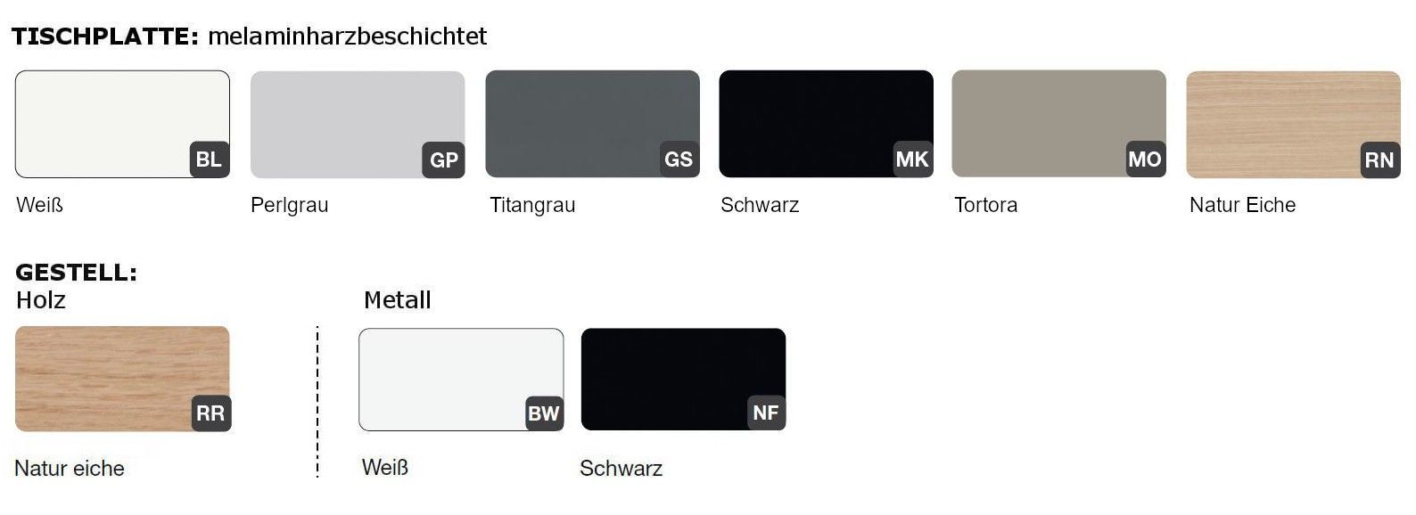 Weiß (BL), Perlgrau (GP), Tortora (MO), Titangrau (GS), Schwarz (MK) und Eiche Natur (RN)