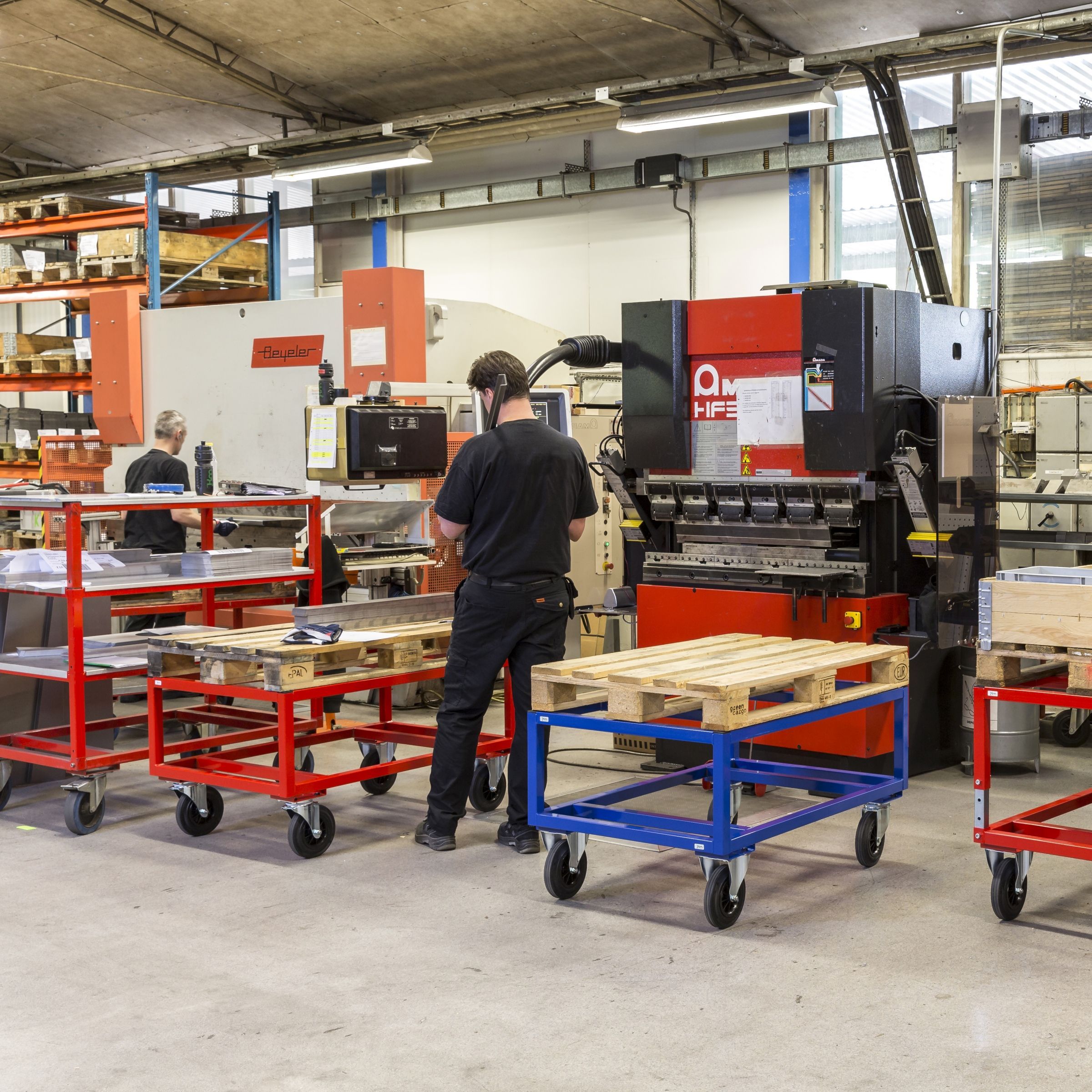 Kongamek Palettenwagen in blau 305mm hoch ohne Bremse fuer Paletten 1200x1000mm