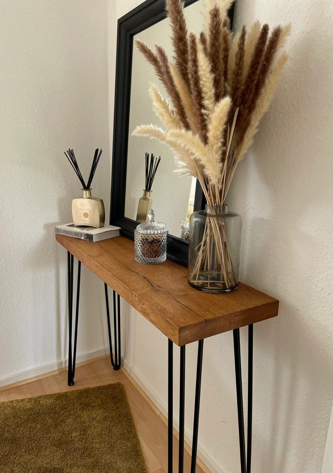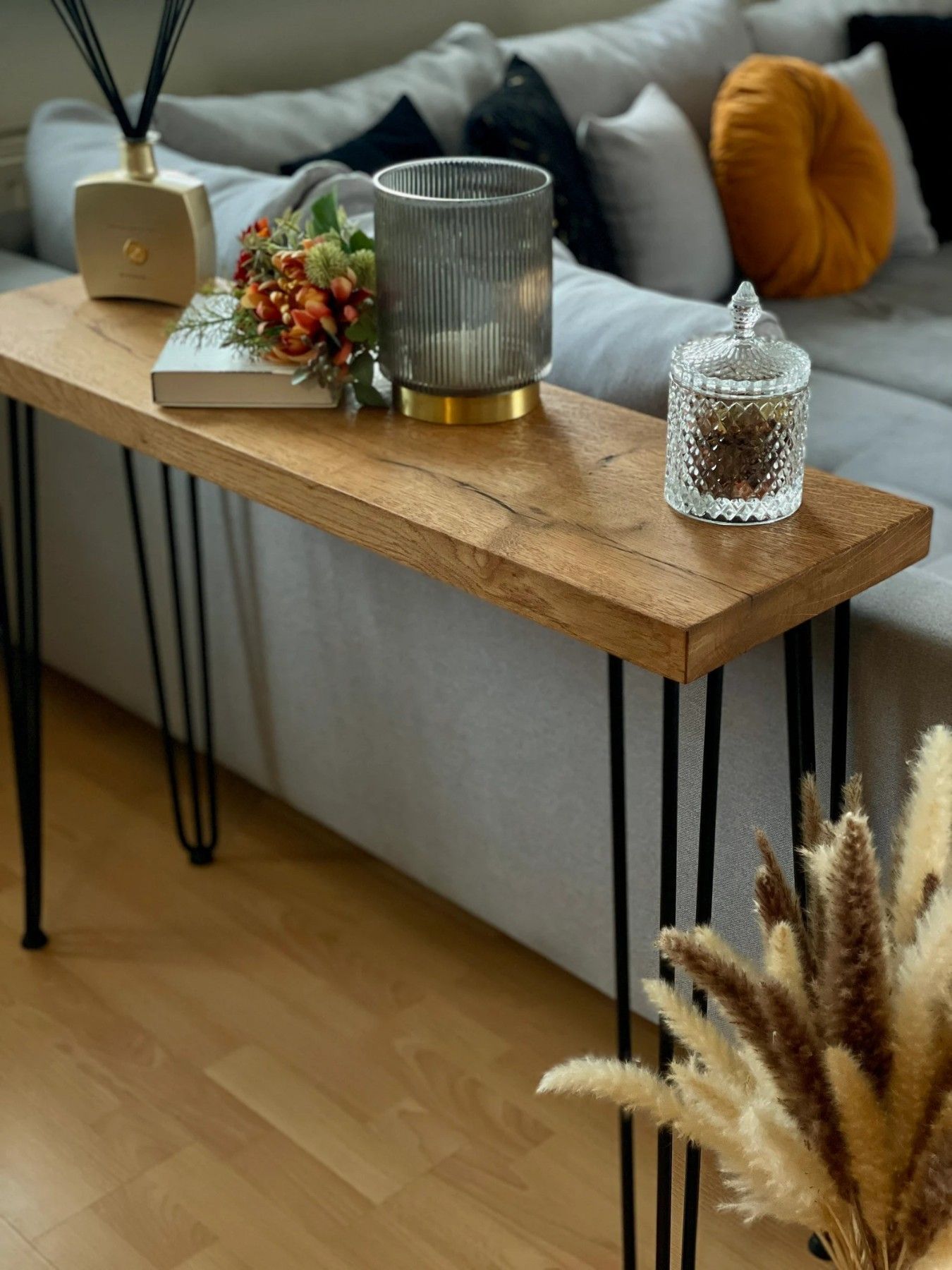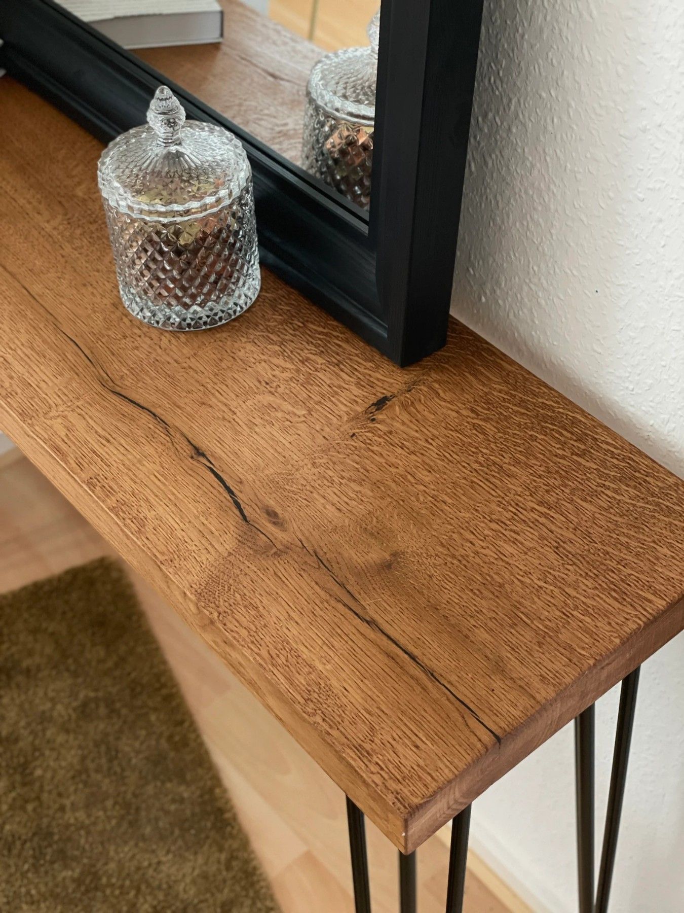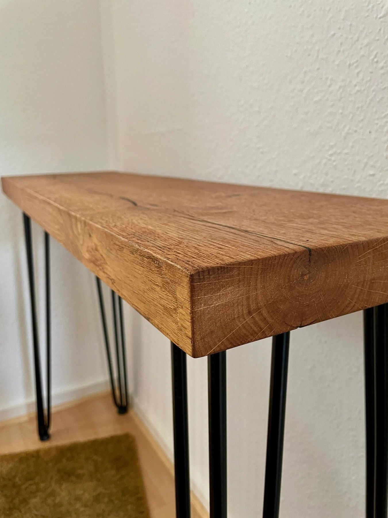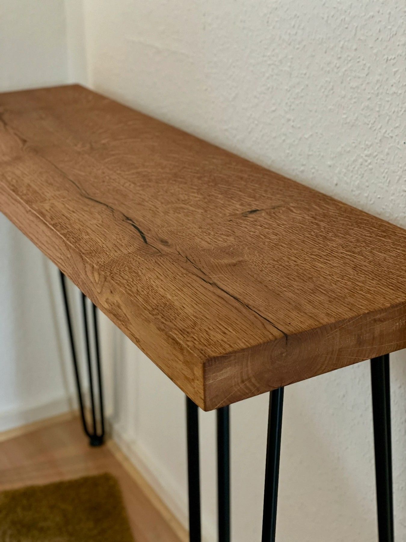 Dieser elegante Konsolentisch aus massivem Eichenholz mit modernen Square Legs ist perfekt für Flur, Wohnzimmer oder Schlafzimmer. Die natürliche Maserung verleiht ihm eine edle Note, während die schlichte Bauweise und luftige Optik den Industrial-Stil unterstreichen. Ideal als Beistelltisch, Sideboard oder Ablage für Dekorationen. Handgefertigt, bringt er natürliche Eleganz und eine besondere Atmosphäre in dein Zuhause.