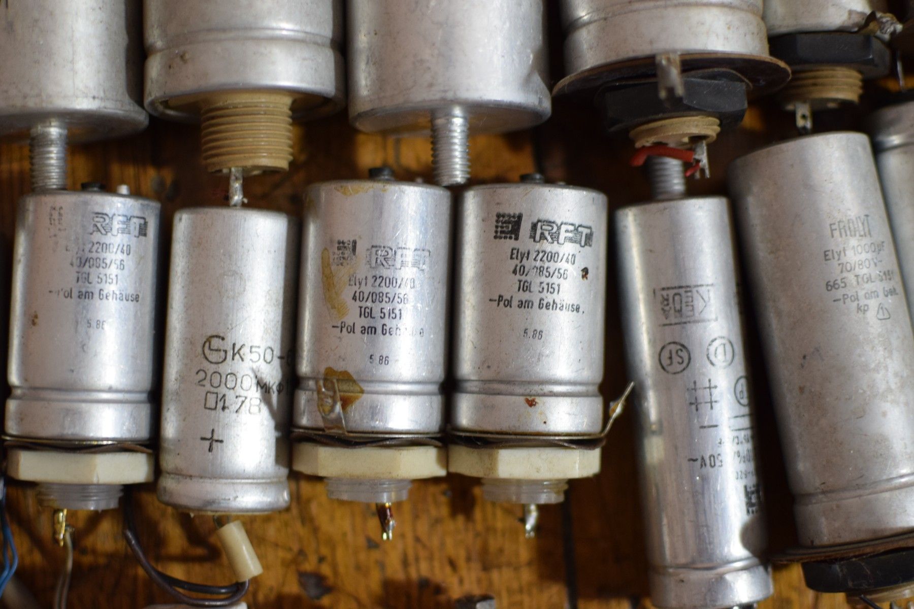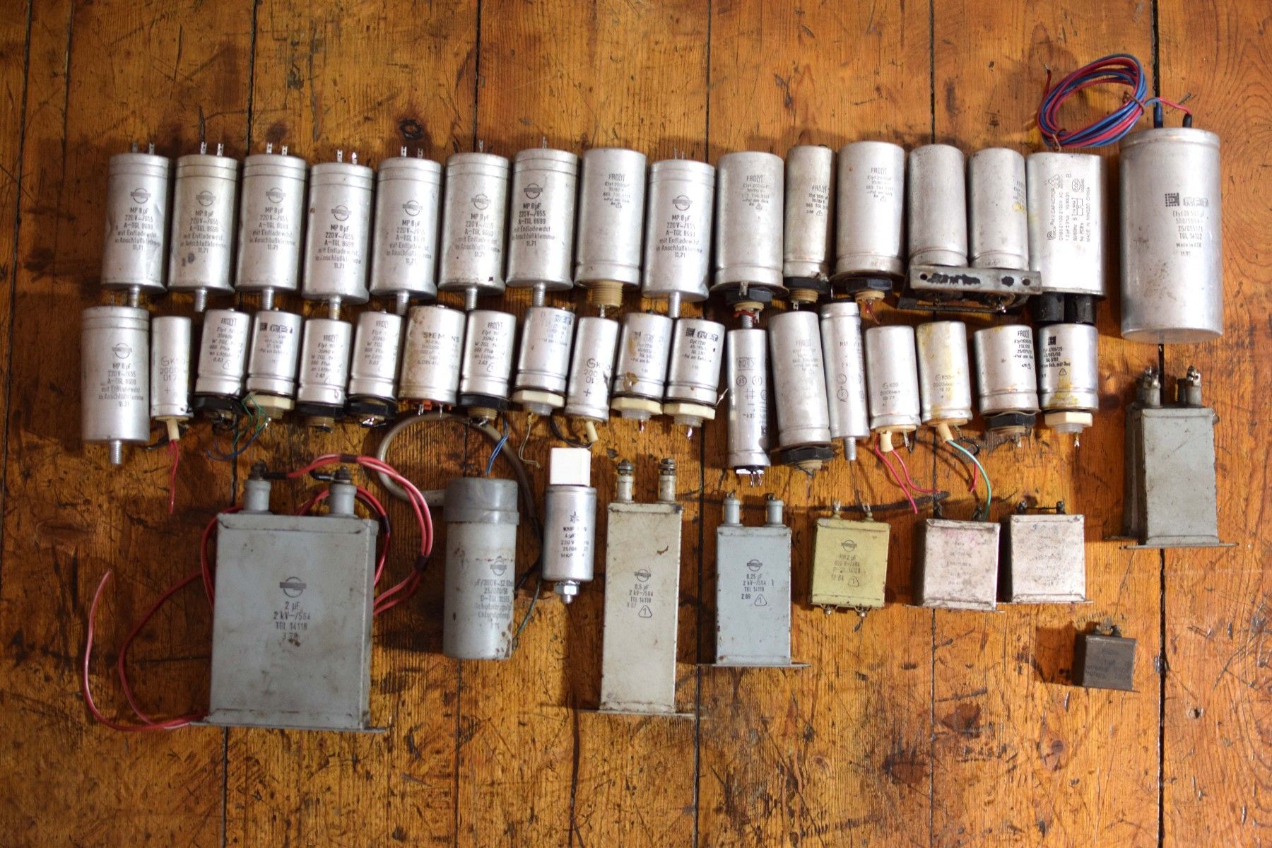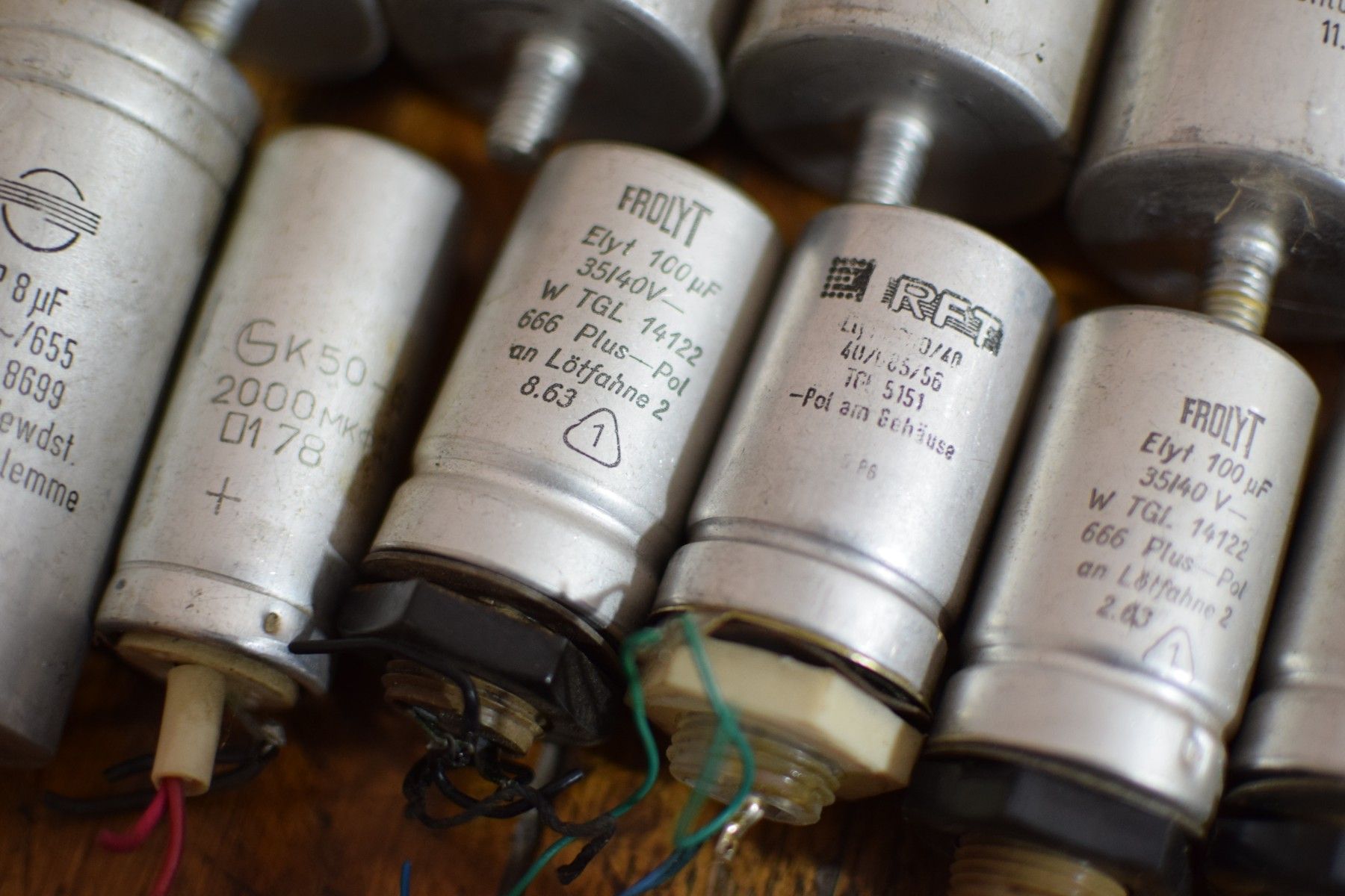 Konvolut von 45 historischen Kondensatoren aus der ehemaligen DDR mit Gebrauchsspuren, funktionsfähig Leistungsdetails soweit verfügbar, bitte den Fotos entnehmen Der Versand innerhalb Deutschlands ist kostenfrei und erfolgt per DHL Paket. Verkauf als Konvolut. Lieferumfang wie abgebildet.