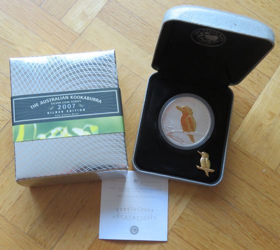 Kookaburra gilded 2007 Original mit Pin 1oz 999 silber The Perth Mint Kookaburra gilded 2007 Original mit PIN! Auflage weltweit 10'000 Stück Wie abgebildet mit PIN, Etui, Kapsel, CoA und Verpackung. (es handelt sich um eine Originalausgabe der Pert Mint ) Achtung: Versand nur 1x die Woche, immer an