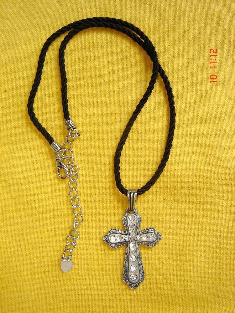 Kordelkette schwarz Kreuz m vielen Steinen Kette Dirndlkette altsilberfarben Z