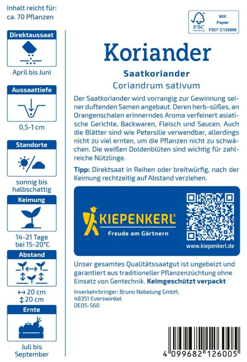 Kiepenkerl Koriander Saatkoriander, zur Ernte von duftenden Samen - gute Bienenweide