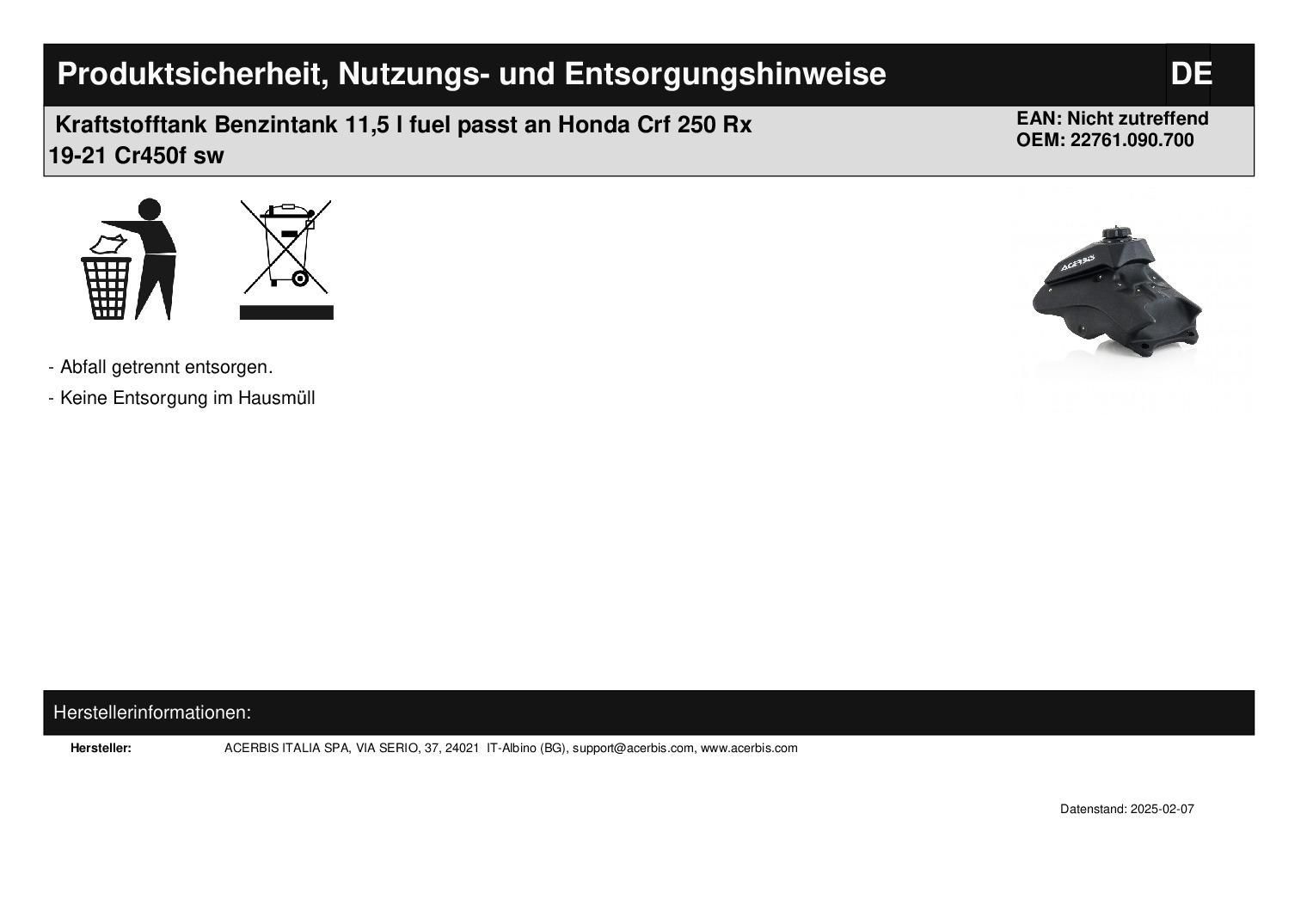 Kraftstofftank Benzintank 11,5 l fuel passt an Honda Crf 250 Rx 19-21 Cr450f sw