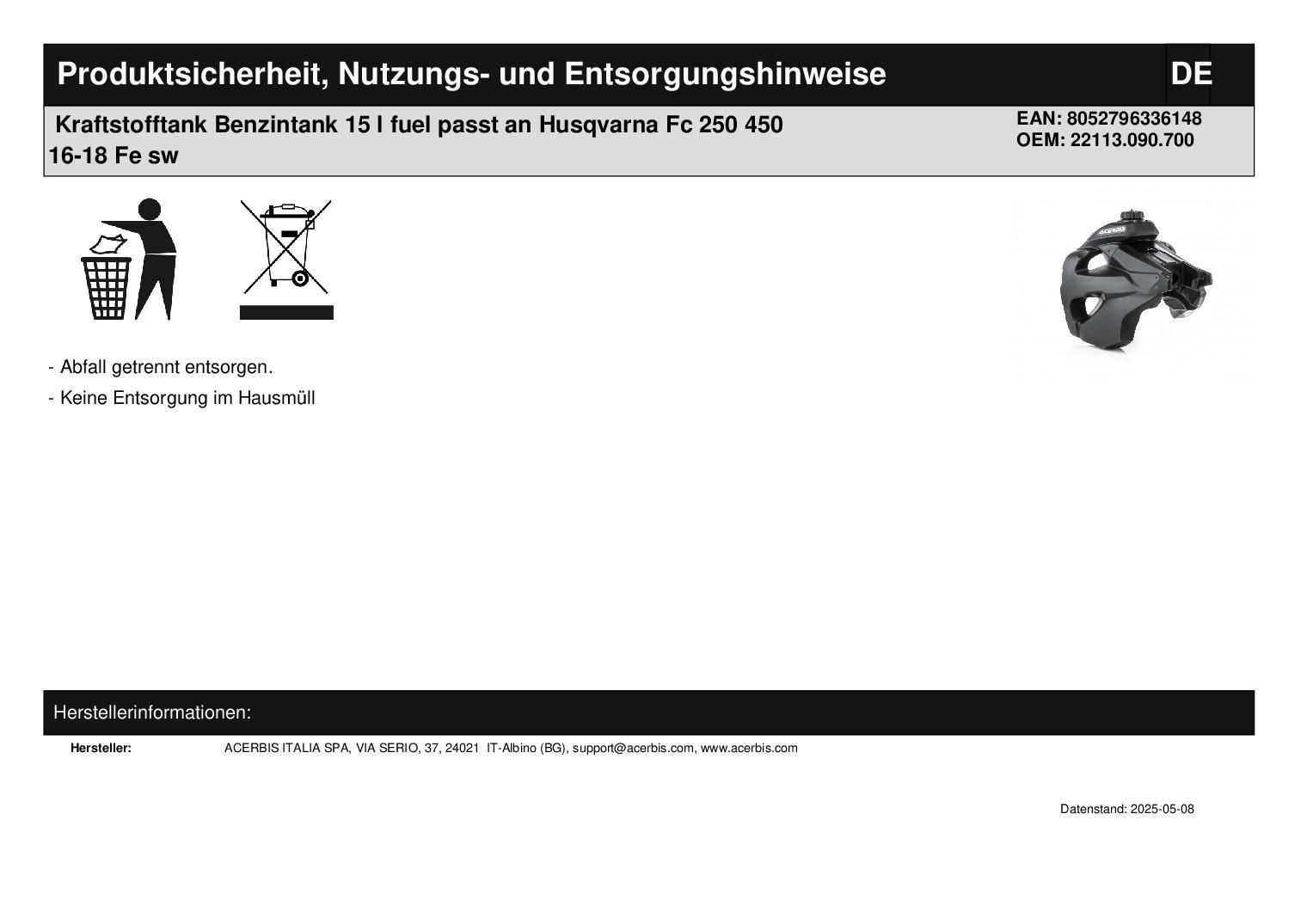 Acerbis Kraftstofftank Benzintank 15 l fuel passt an Husqvarna Fc 250 450 16-18 Fe sw