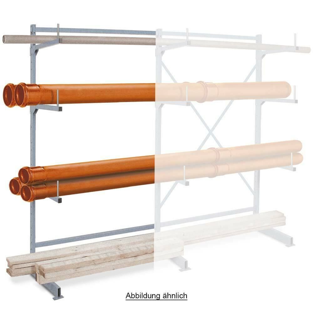 Arme im Raster von 150 mm in der Höhe verstellbar Armlänge 400 mm Ständerachsmaß 1030 mm Tragkraft je Arm 50 kg Tragkraft je Ständer 150 kg Die Fußebene ist unbegrenzt belastbar Komplett verzinkt BxTxH 1030 x 450 x 1950 mm Kragarm-Anbauregal, Kragarmregal, Langgutregal, Armregal, Stangenregal, Regal