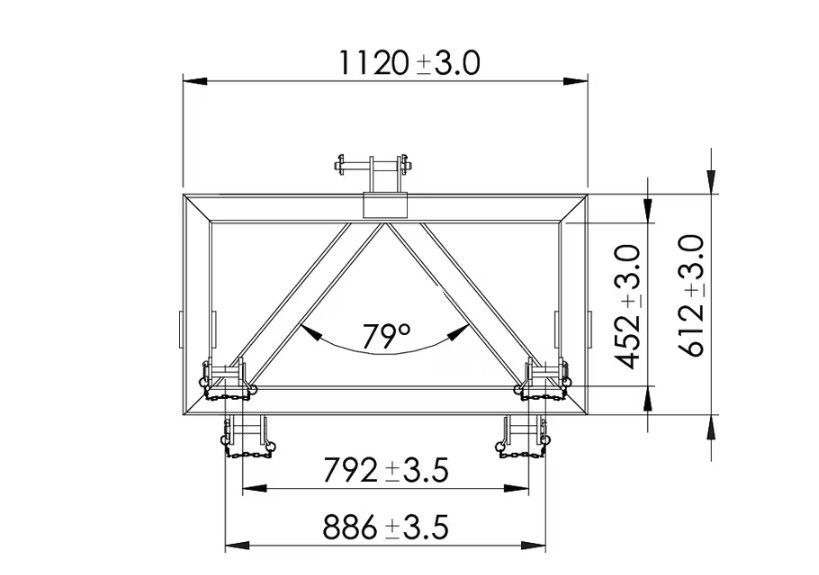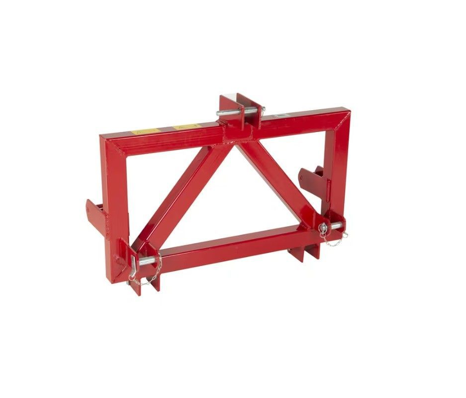 Dreipunktadapter für Euro-Norm Schnellwechselsysteme. Verbindet Euro-Norm Maschinen mit Kat. 2 Frontladern. Maximale Stützlast 750 kg. Gesamtabmessungen: 1150 mm Breite × 610 mm Höhe. Rahmenprofilbreite 81 mm. Bolzenausführung Kat. 2. Ideal für landwirtschaftliche Anwendungen und Schnellwechsel-Arbe