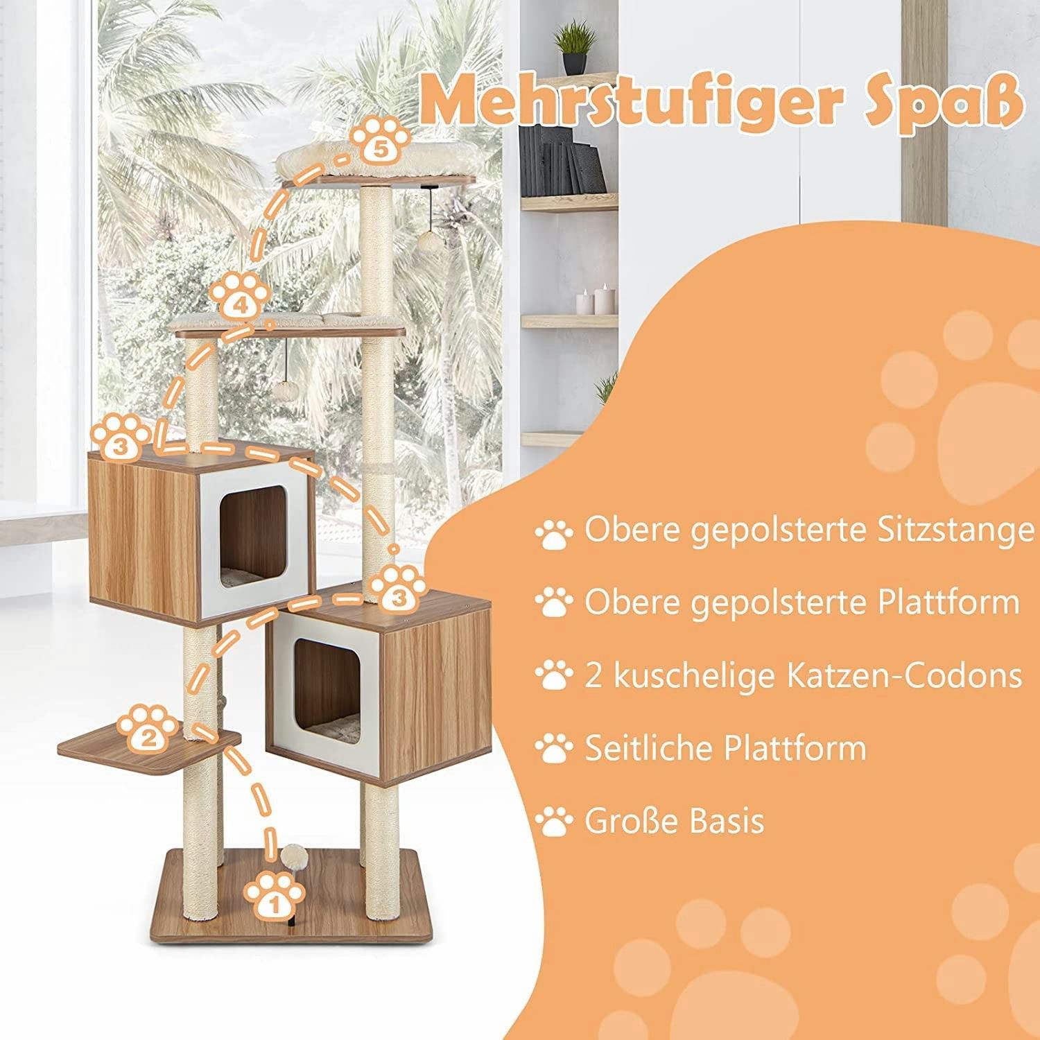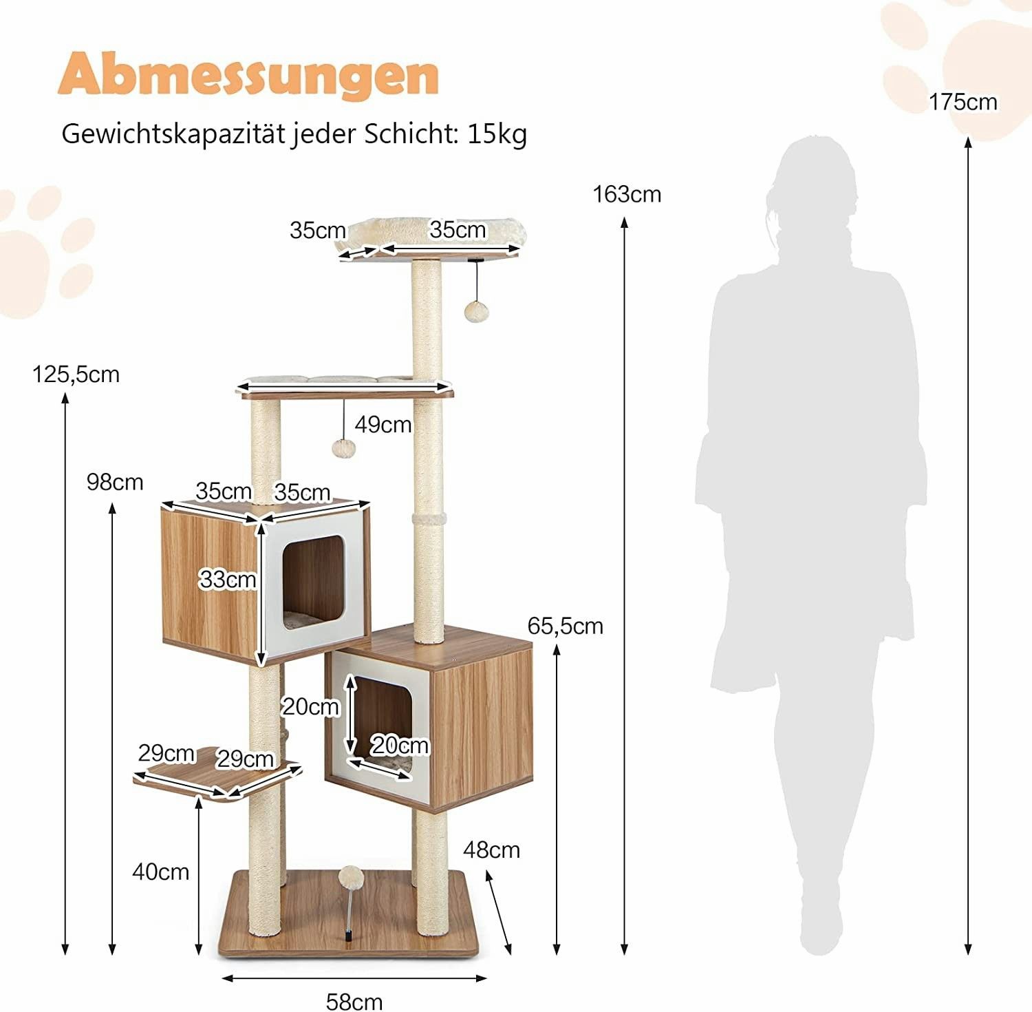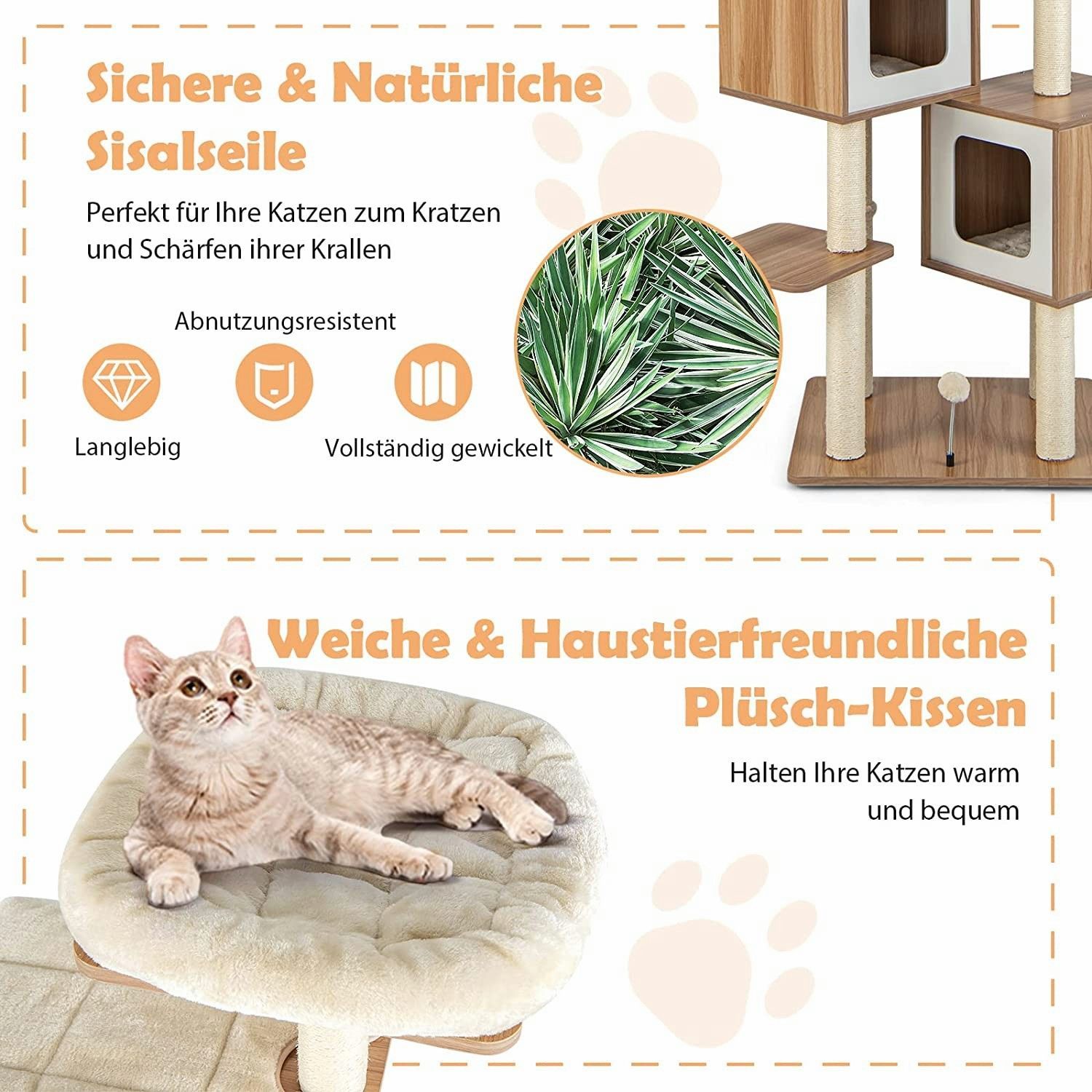 Kratzbaum 163 cm, Katzenbaum mit Sisalstämmen & waschbaren Kissen & Sitzplattform
