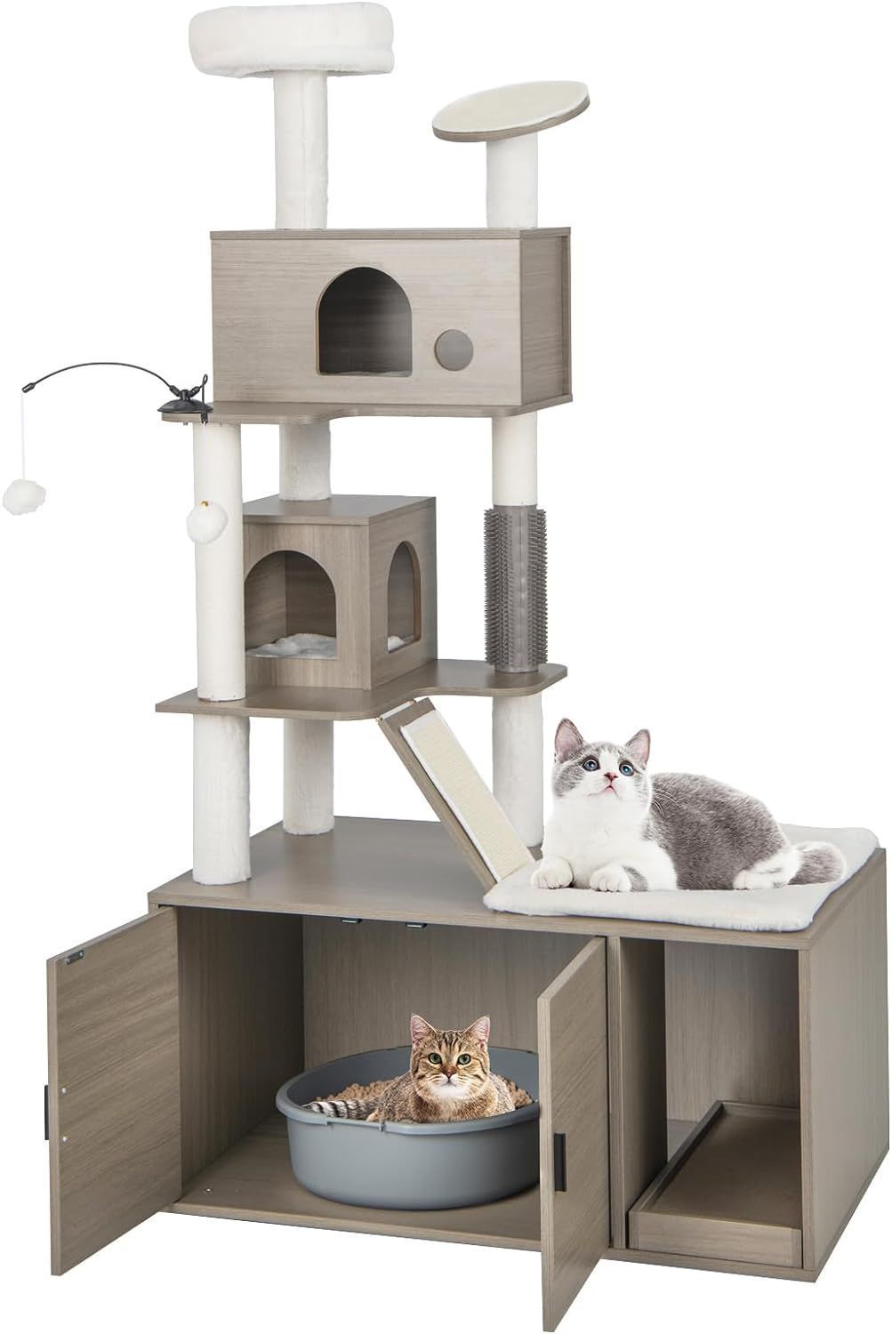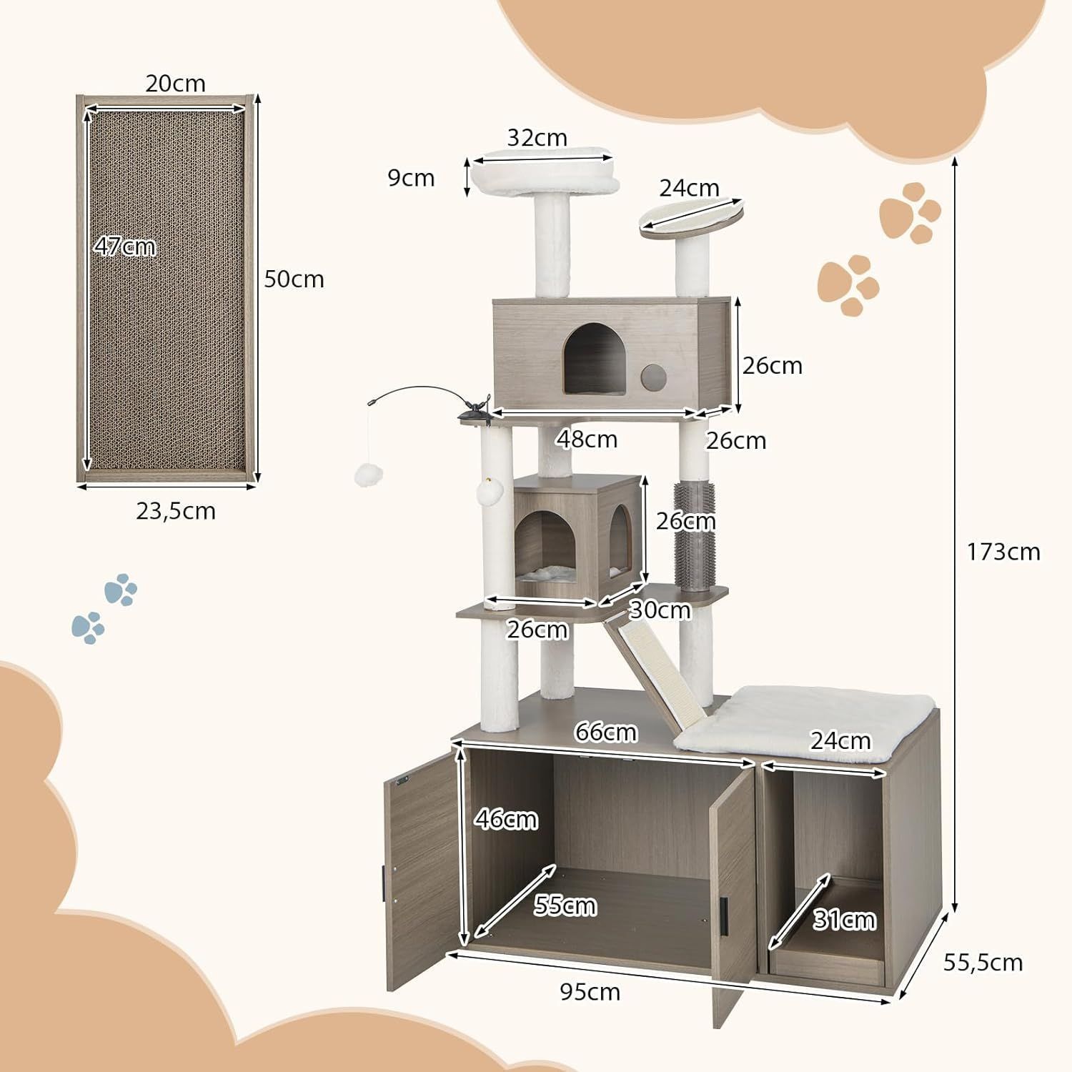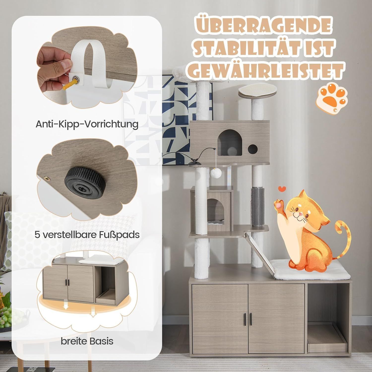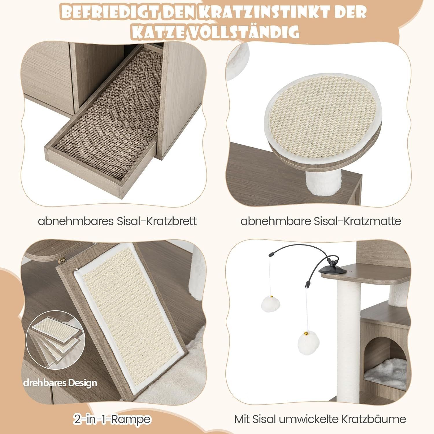 Kratzbaum mit Katzenklo, 2-in-1 Katzenbaum mit 2 Häusern, Sitzfläche, Sisalstümmen