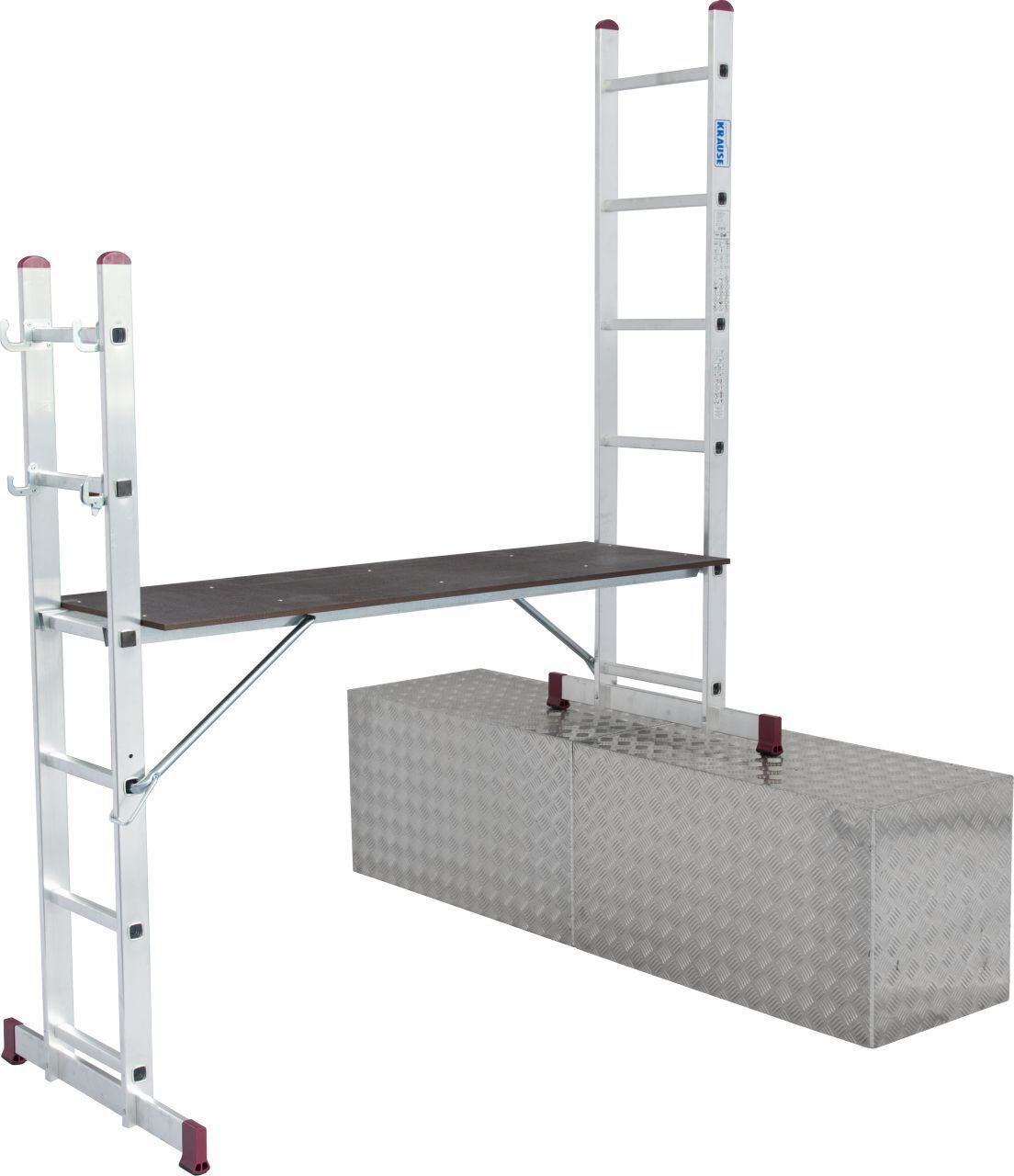 KRAUSE Corda Alu Leiter-Baugerüst Artikelbeschreibung: Bestehend aus zwei Leitern mit je einer Traverse und freitragender Arbeitsplattform. Verwendbar als Arbeitsbühne, Bockleiter und Anlegeleiter. Auch auf Treppen und Absätzen verwendbar Die Belagbühne (147 x 50 cm) ist nässeversiegelt und rutschhe