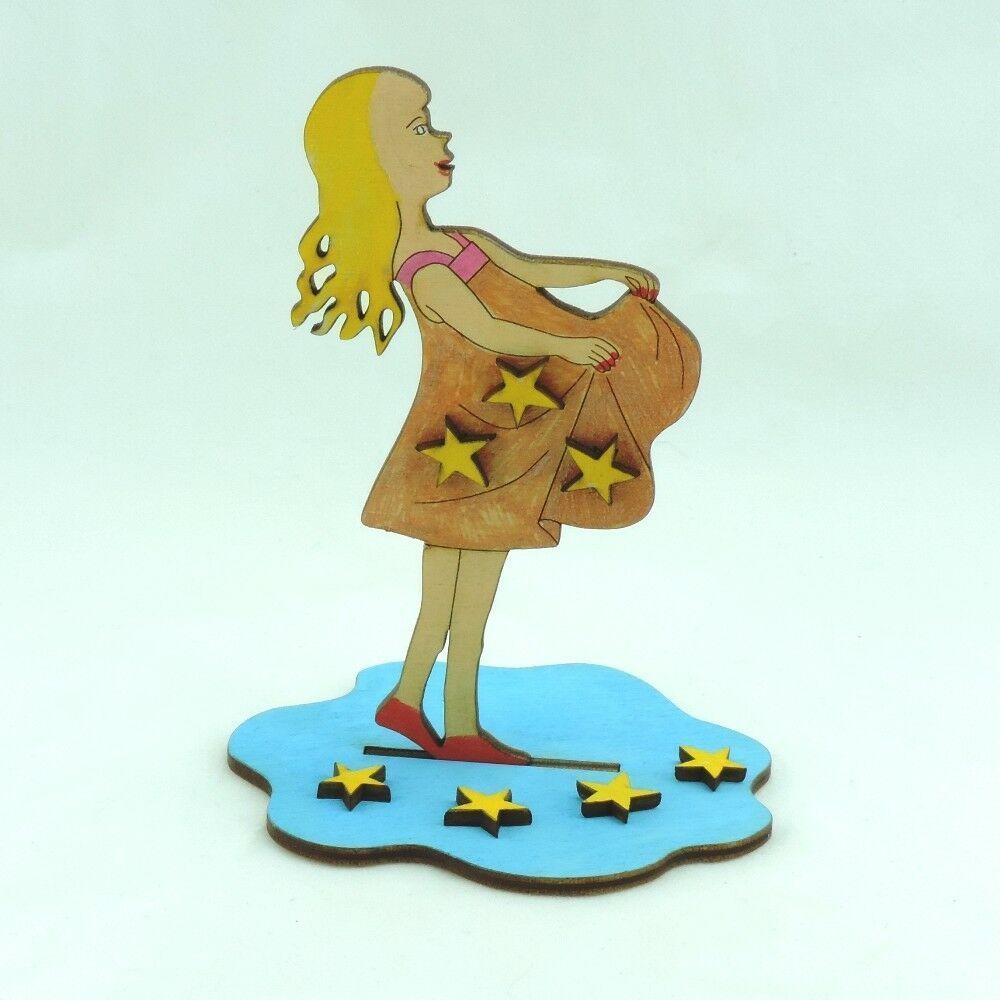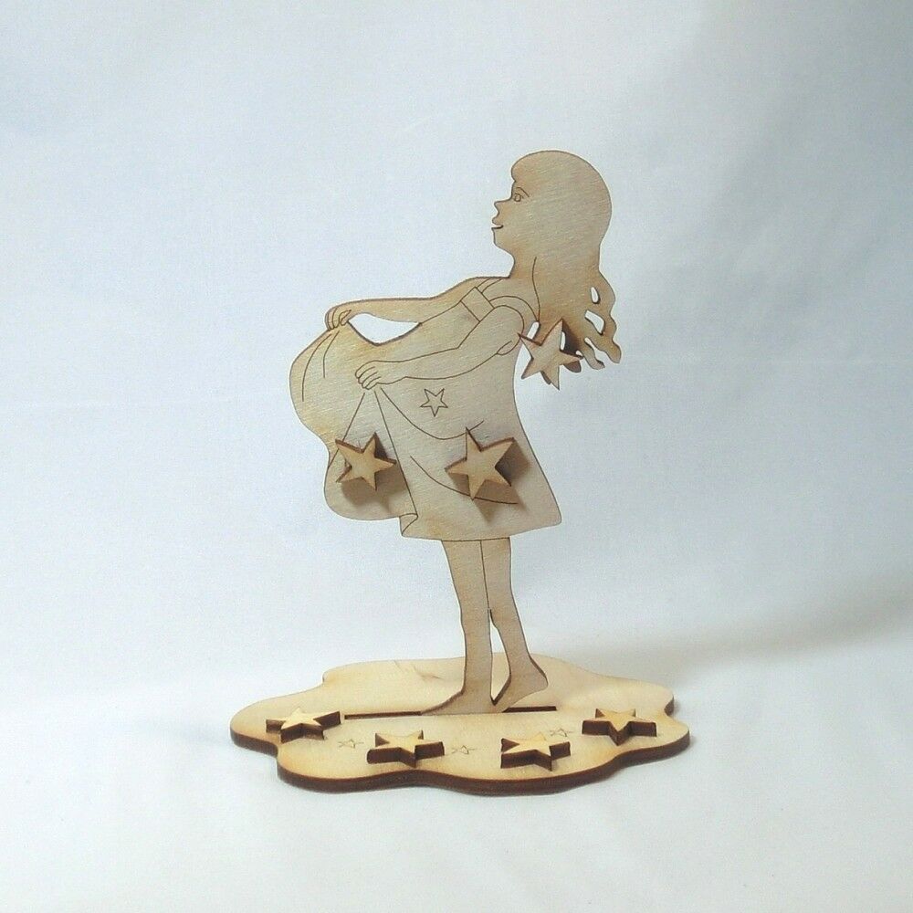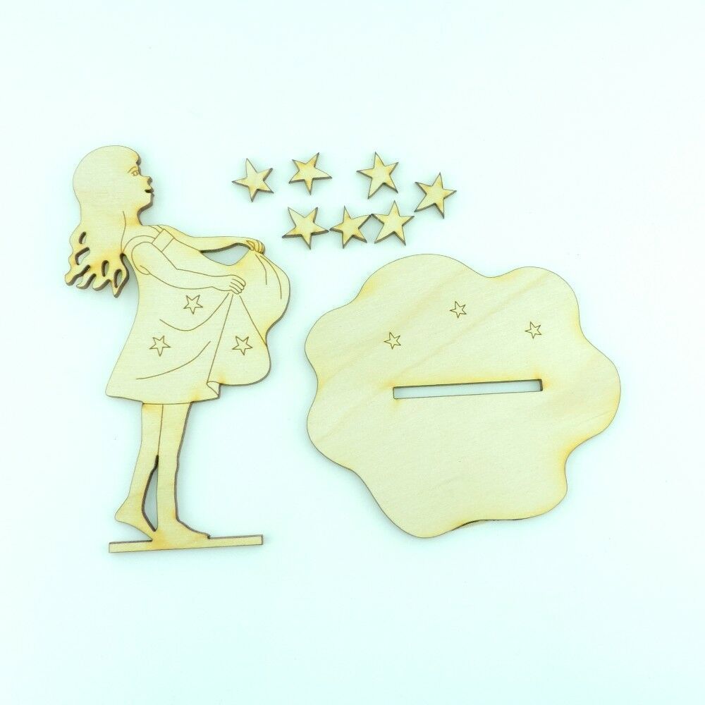 Sterntalermädchen mit Sterne, sowie Unterplatte zum Hinstellen. Es besteht aus 9 Teilen, die dann zusammen gesteckt und geklebt werden können. Die Bodenplatte hat eine Größe von 96mm und hat drei Sterne vorgezeichnet, das Mädchen ist 120mm hoch und 66mm breit. Passend dazu die Sterne Sie bekommen di