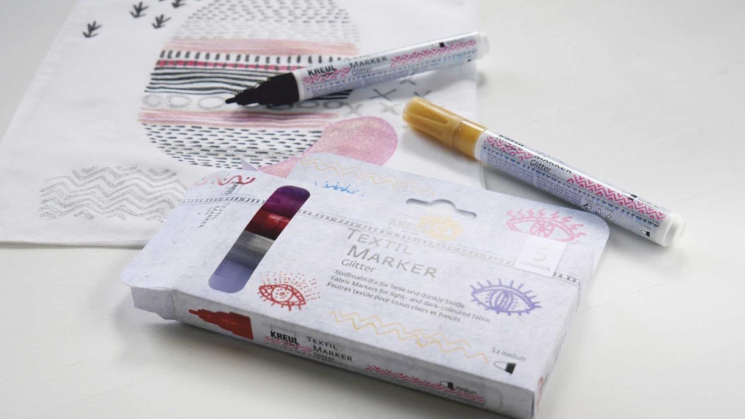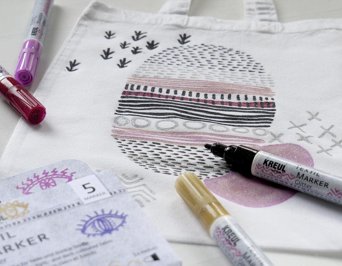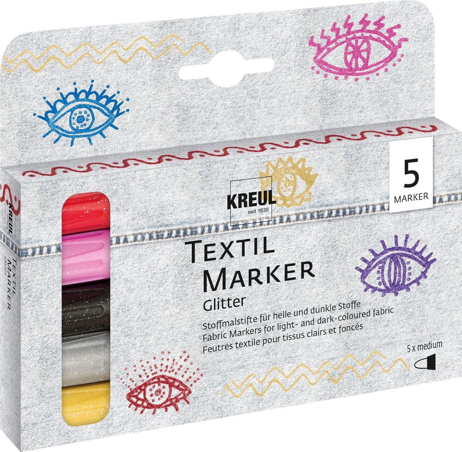 KREUL 92651 - Textil Marker Set Glitter, medium, 5 Stück, Strichstärke 2 bis 4 mm, au