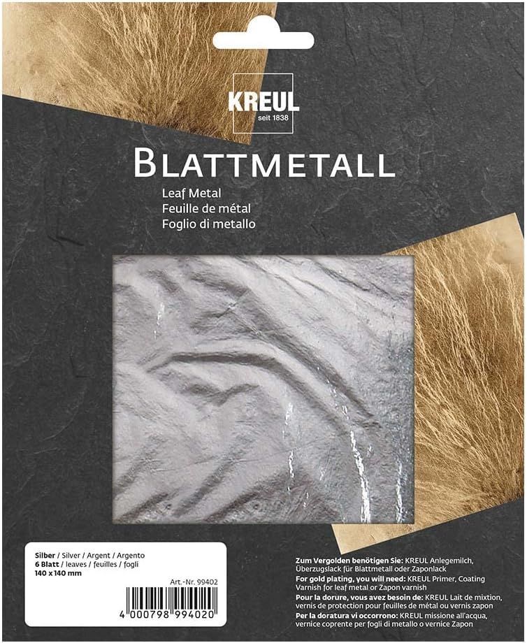 KREUL 99402 - Blattmetall Silber, 14 x 14 cm, 6 Blatt, für hochglänzende, metallische Effekte, zum Veredeln von Holz, Glas, Papier, Leinwand, Karton, Styropor, Kunststoff, Wachs, Keramik uvm. Marke Kreul Farbe Silber Material Metall Papieroberflächen Hochglanz Produktabmessungen 14L x 14B cm Info zu... Mehr