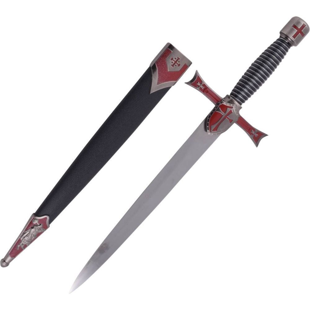 Kreuzritterdolch, Kreuzparierstange, rot-schwarze Scheide, mit Stahlklinge