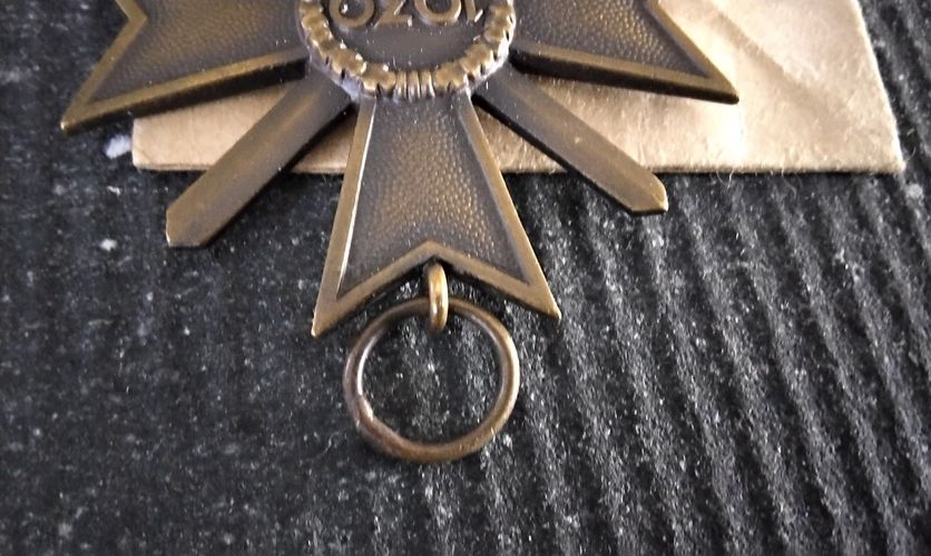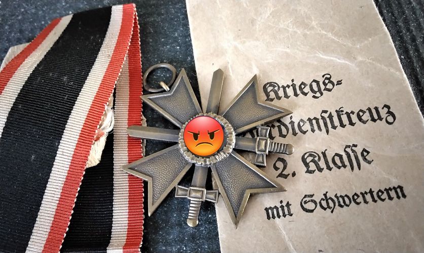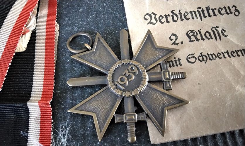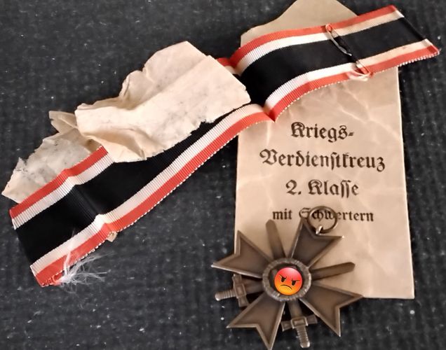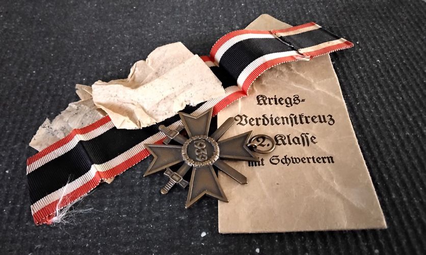 Verkauf nur unter Beachtung des Paragraphen 86, speziell 86a des StGB. KVK 1939 mit Schwertern in original Tüte mit original Band und dem Trennpapier. So Vollständig sehr selten. Hier angeboten werden die letzten drei aus meiner Sammlung. Hersteller 14 = Friedrich Orth Wien. Das original Band ist un