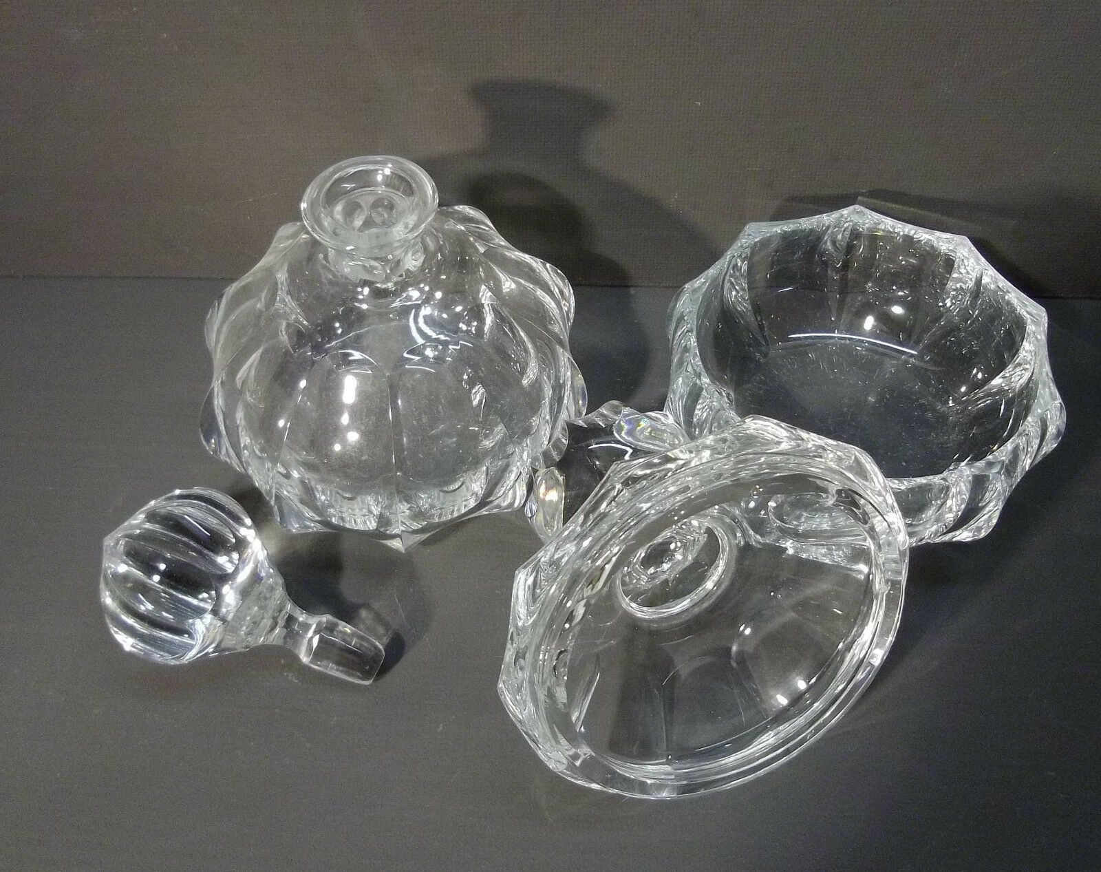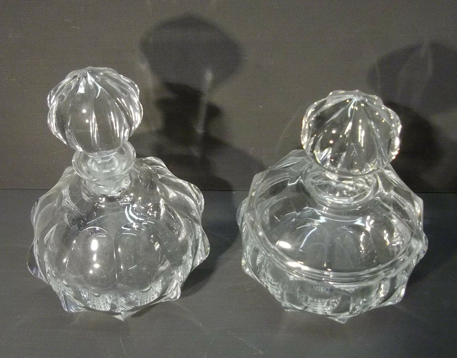 Kristall-Schminkset um 1900. Bestehend aus 1 Parfümflasche mit eingeschliffenem Stöpsel und 1 Deckeldose für Puder. Ohne jeden Abplatzer. Schweres Bleikristall. Feines Design. Maße: H 15 bzw. 17 cm. Antikes am Deich - Inh: Oliver Kipp-Trense G M T Sprache erkennen Afrikaans Albanisch Arabisch Armeni