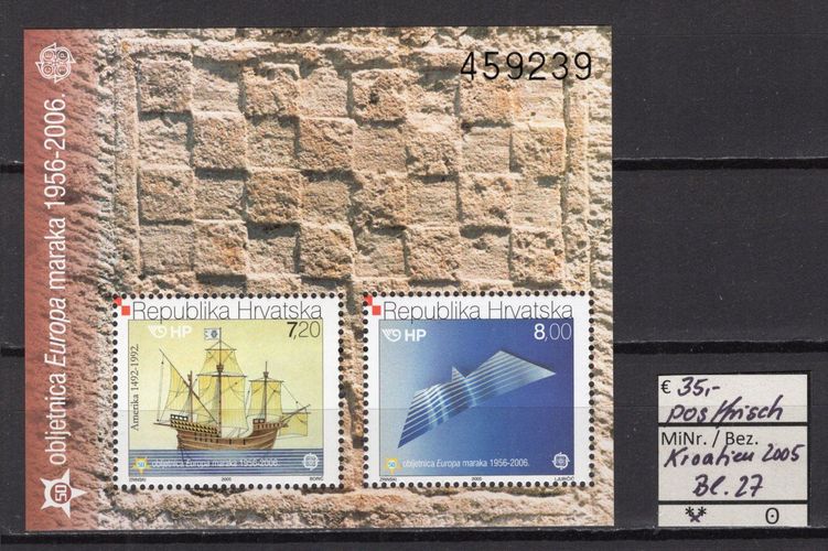 Kroatien 2005 50 Jahre Europamarken Blockausgabe 27 postfrisch Michelkatalogpreis 35,-€ Ich löse meine umfangreiche Briefmarkensammlung auf. Beim Kauf mehrer Artikel zahlen Sie nur die tatsächlich anfallenden Versandkosten, diese richten sich nach dem Gewicht der Sendung und den gültigen Versan