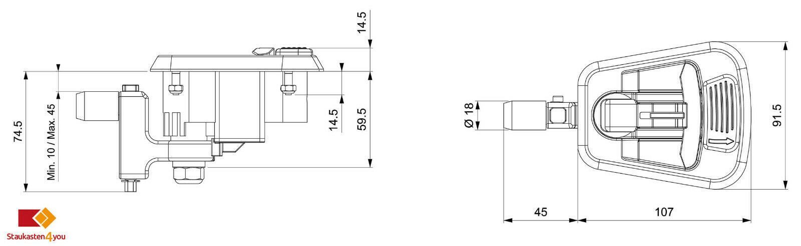 T-Riegelverschluss Krompressionsverschluss groß verstellbar abschließbar schwarz T-Riegelverschluss, Kompressionsverschluss, groß, verstellbar, abschließbar abschließbar mit 1 Schlüssel, Schutzkappe Gummidichtung hinten, Dichtung durch Kompression einsetzbar für Wandstärken von 10 - 45 mm Einfaches