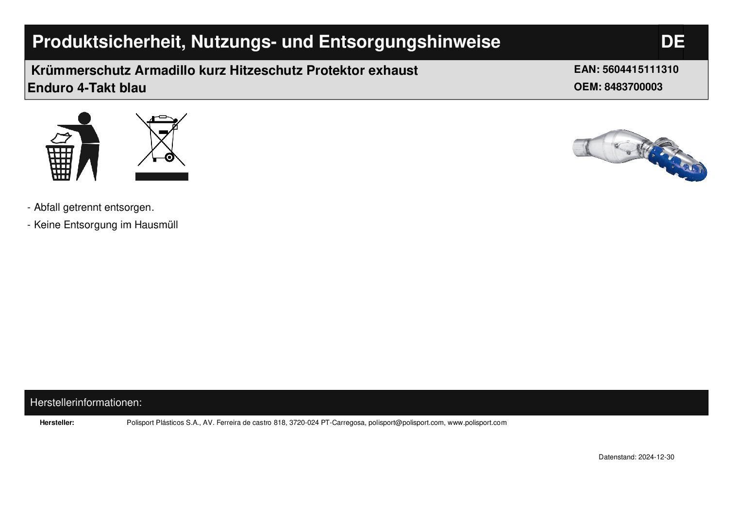 Polisport Krümmerschutz Armadillo kurz Hitzeschutz Protektor exhaust Enduro 4-Takt blau