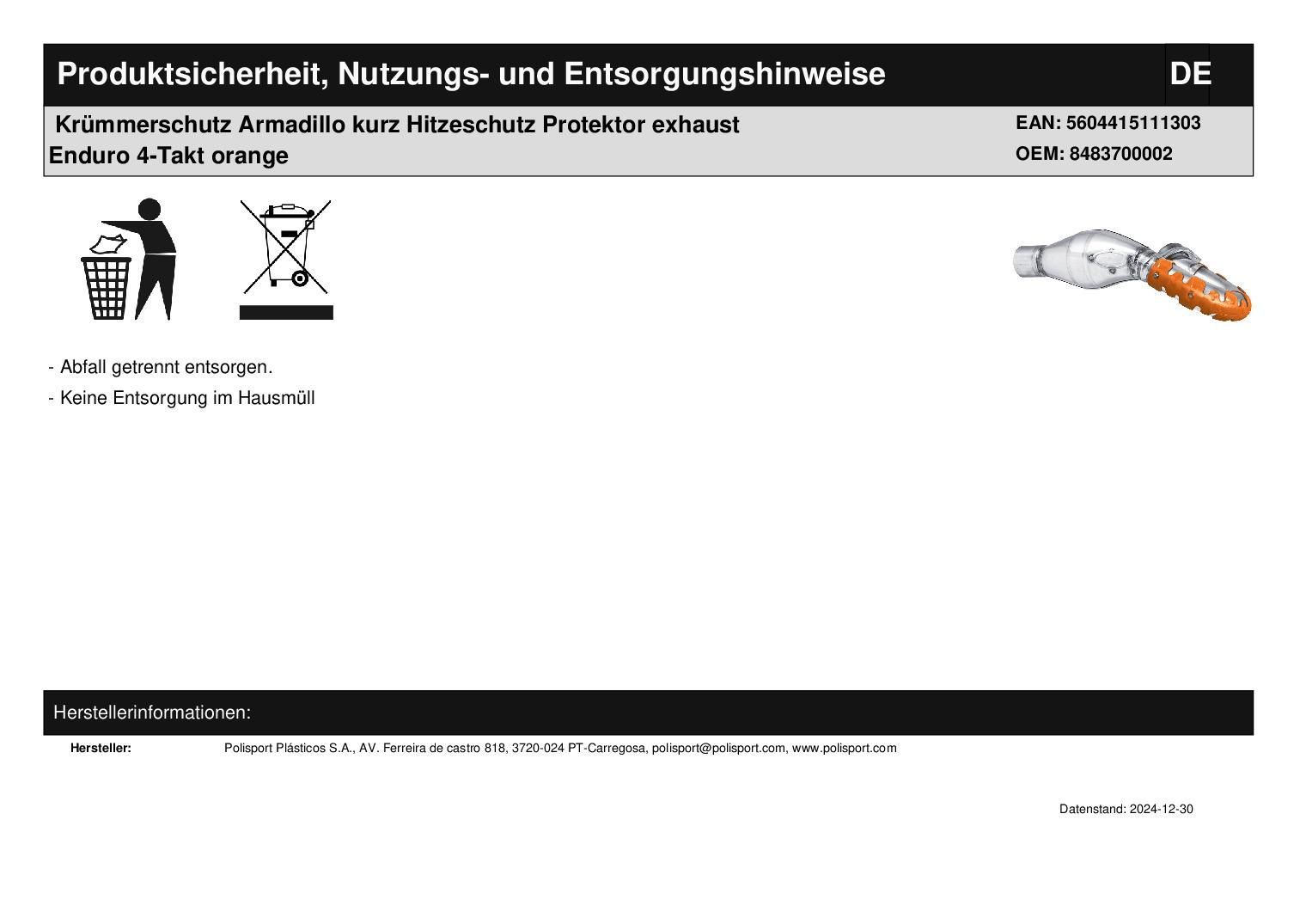 Polisport Krümmerschutz Armadillo kurz Hitzeschutz Protektor exhaust Enduro 4-Takt orange