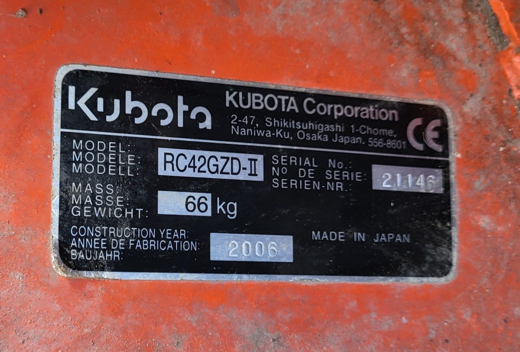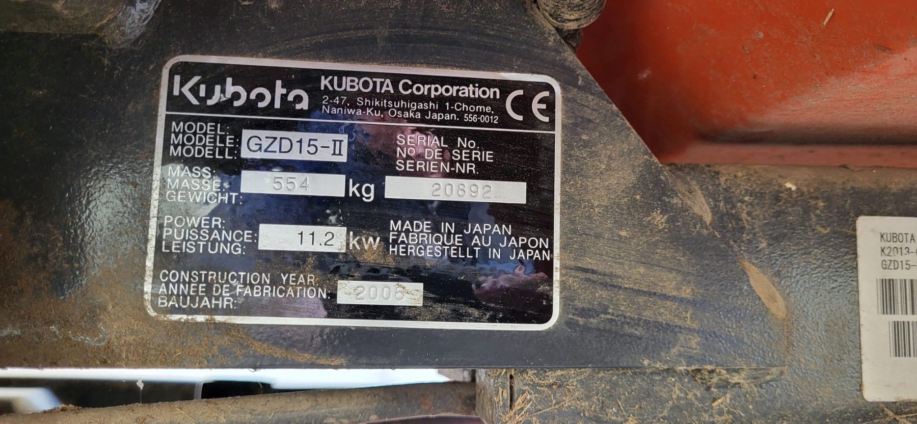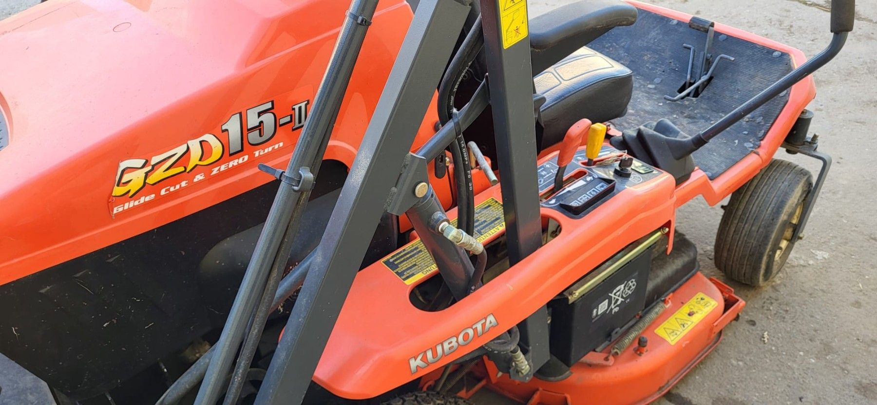 Gebrauchter Kubota Zero Turn Aufsitzmäher, Modell GZD15-II HD, Baujahr 2006. Dieselmotor, 11,2 kW, Hydrostat, Fangkorb, Mähdeck RC42GZD-II. Maschine startet, fährt und mäht. Normale Gebrauchsspuren. Ideal für Hof, Garten oder als Ersatzteilträger. Gewicht: 554 kg Stundenstand: laut Anzeige (siehe Foto)