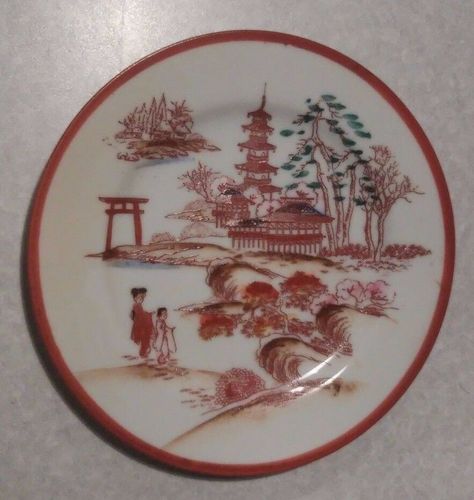 Teller Kuchenteller roter Rand Durchschitt 17 cm Japan Boden: Mount Fuji und japanische Schriftzeichen Ansicht: Geisha Pagode Bäume Häuser See ... Bei Interesse können bis zu 5 weitere gleiche Teller zum jeweils gleichen Auktionspreis hinzu erworben werden. Beachten Sie bitte auch meine weiteren Auk