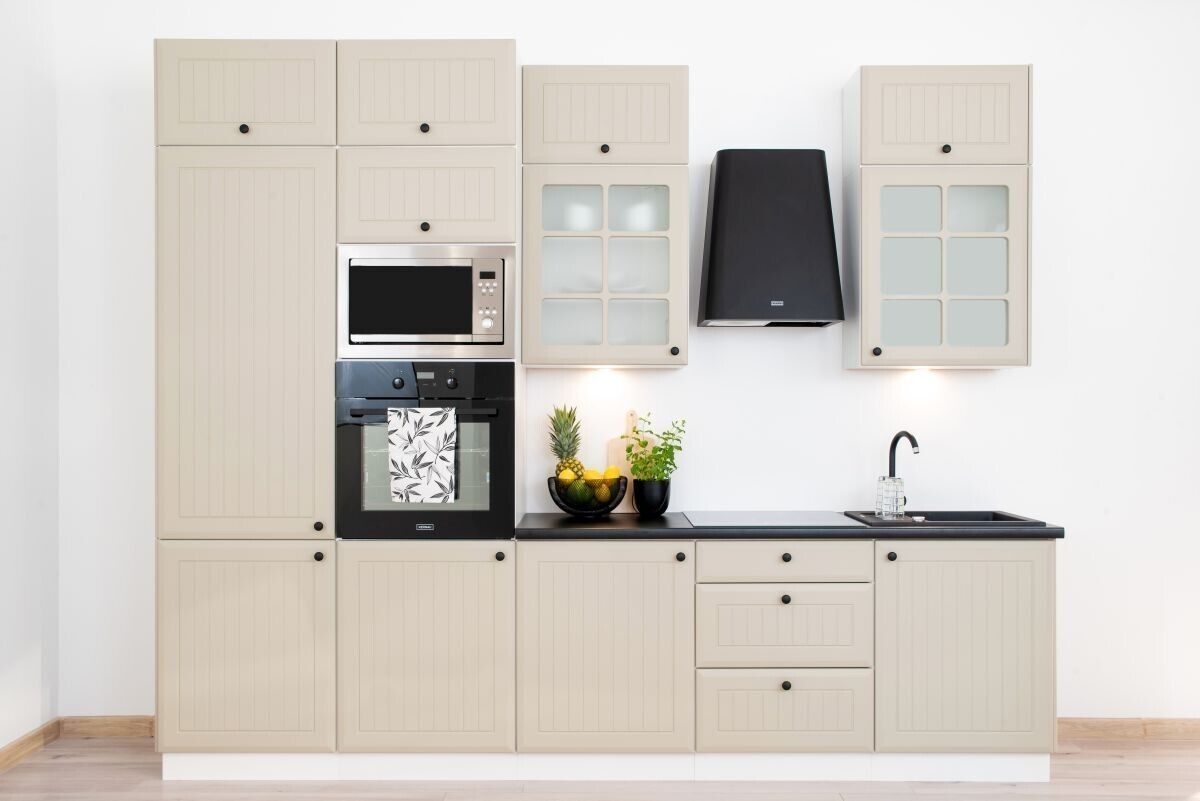 Beispiel Küche Trend Line variabel stellbar NEU & Schnell Fronten: Irma Kaffee matt Griffe Knopf schwarz Korpus und Sockel: weiss Der Preis versteht sich für Musterküche unten beschrieben ohne E-Geräte, Arbeitsplatten, Spüle und Dekoration. Griffe und Sockel sind im Preis enthalten. Lieferumfang
