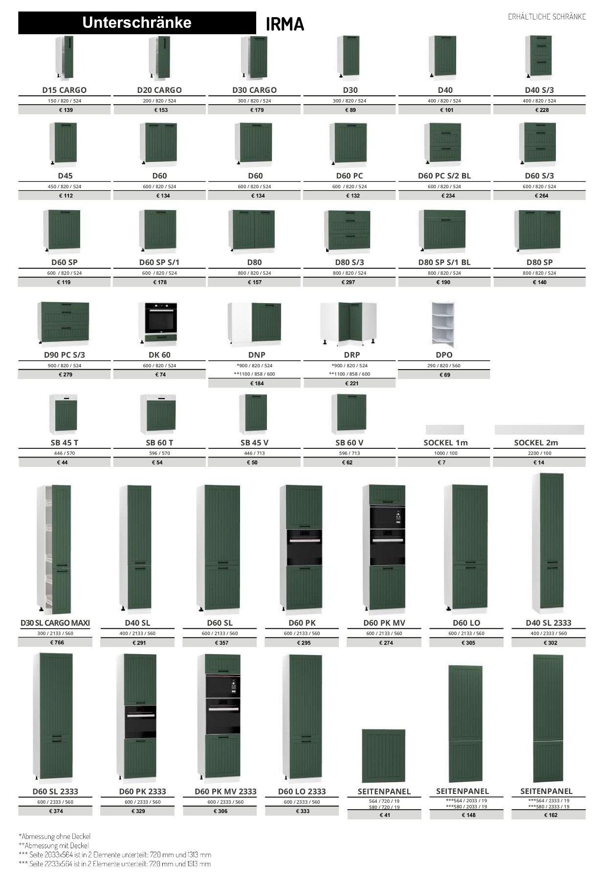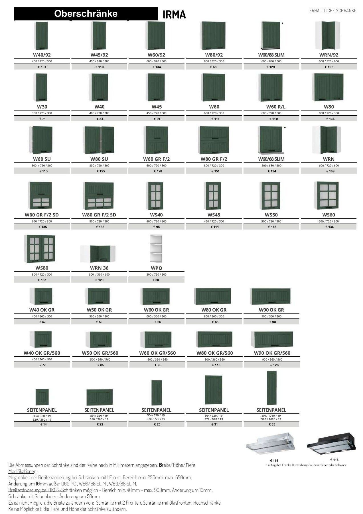 Küche Trend Line variabel stellbar NEU & Schnell Fronten: Irma Grün matt Griffe Lounge Korpus und Sockel: weiss Der Preis versteht sich für Musterküche unten beschrieben ohne E-Geräte, Arbeitsplatten, Spüle und Dekoration. Griffe und Sockel sind im Preis enthalten. Lieferumfang: Schränke von lin