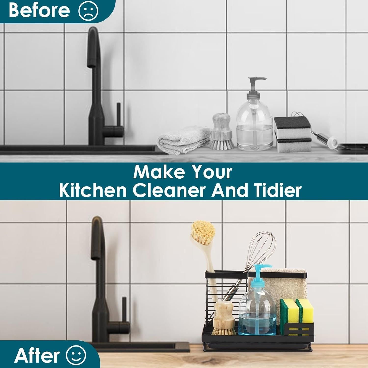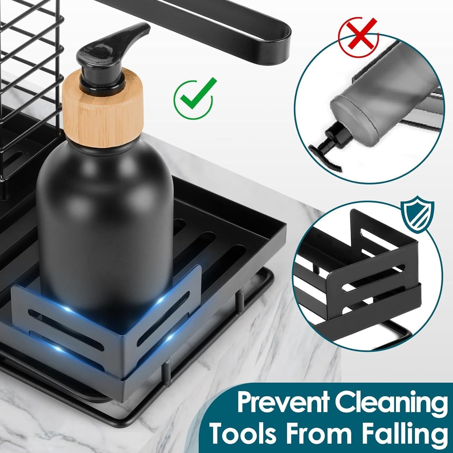 Super Kapazität Lagerung: Der schwarze Spülbecken-Organizer bietet großzügigen Stauraum für Küchenreinigungszubehör wie Spülbürsten, Seifenflaschen und Schwämme und spart Platz. Hollow Drainage Design: Das hohle Design sorgt für schnelle Trocknung, während Schmutzwasser in die leicht abnehmbare Auffangschaletropft. Rostschutz & Langlebigkeit: Hergestellt aus hochwertigem, rostfreiem Kohlenstoffstahl für Langlebigkeit und Stabilität.