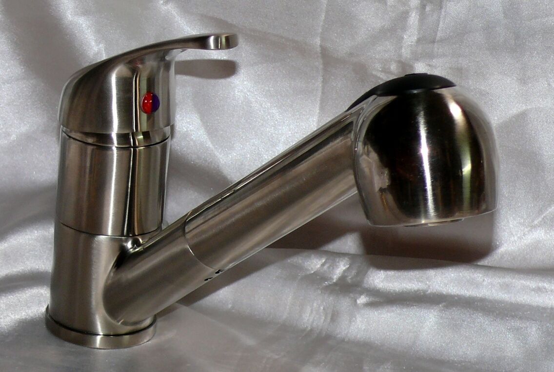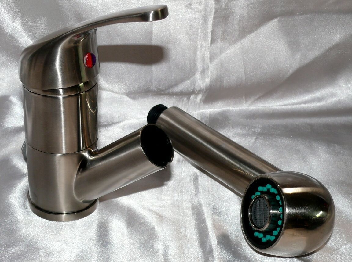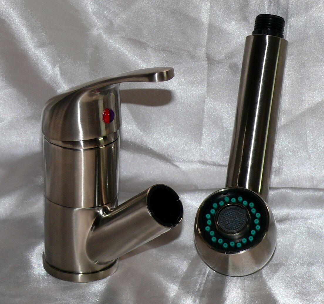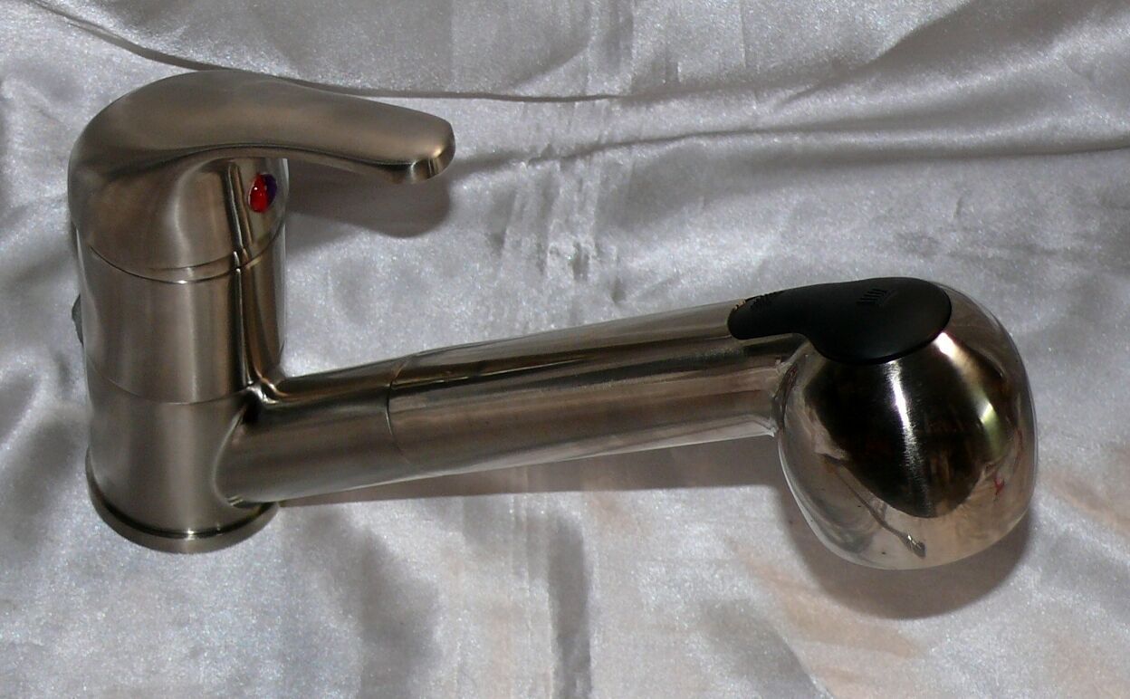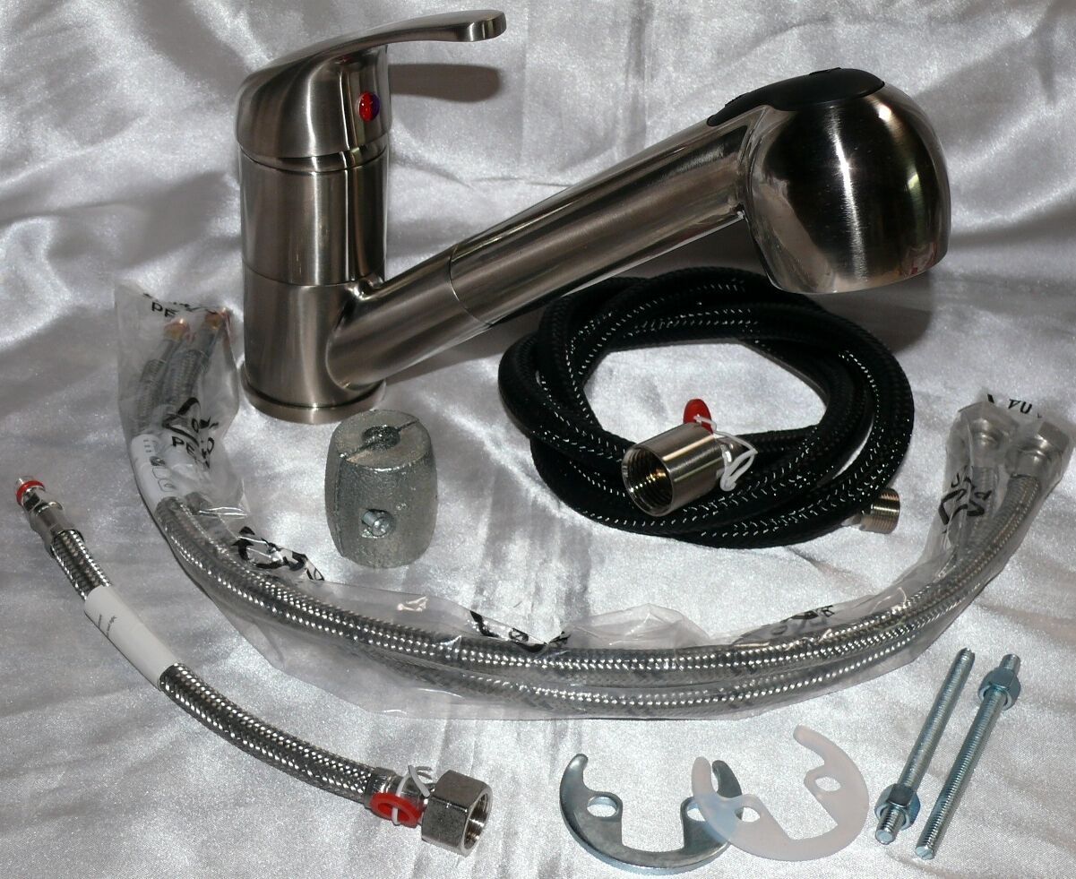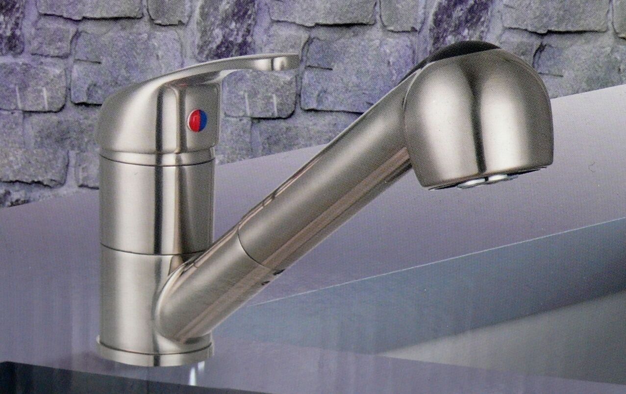 • Spültischarmatur Niederdruck, ausziehbare Brause, Edelstahloptik, Küchen Wasserhahn
