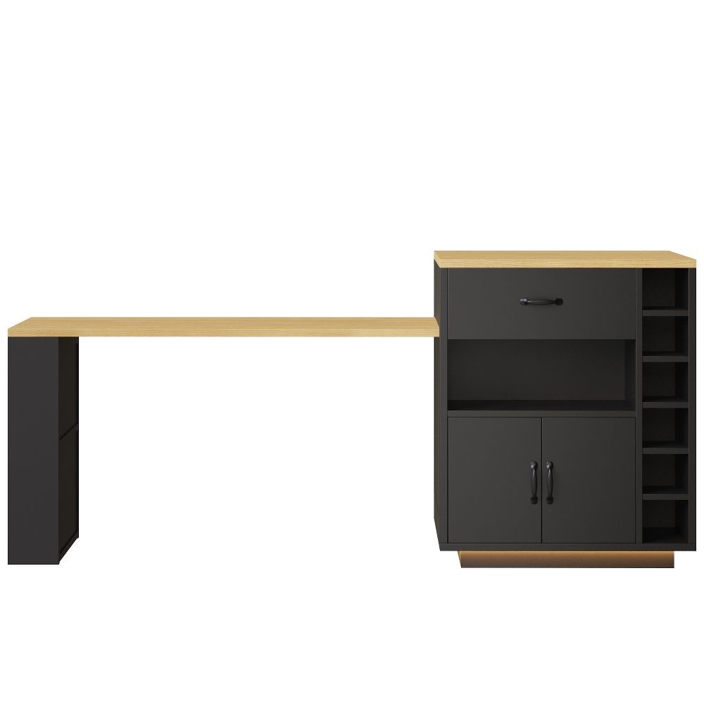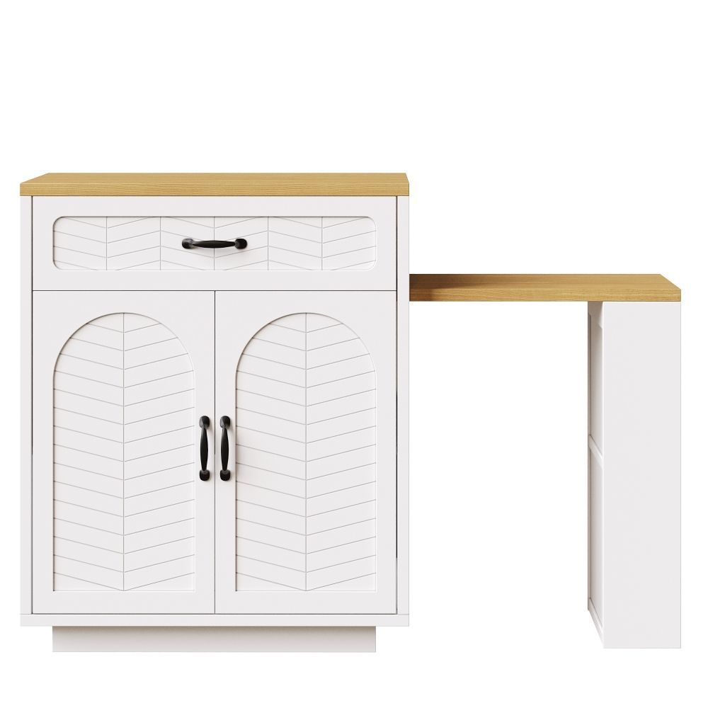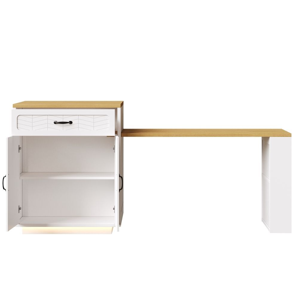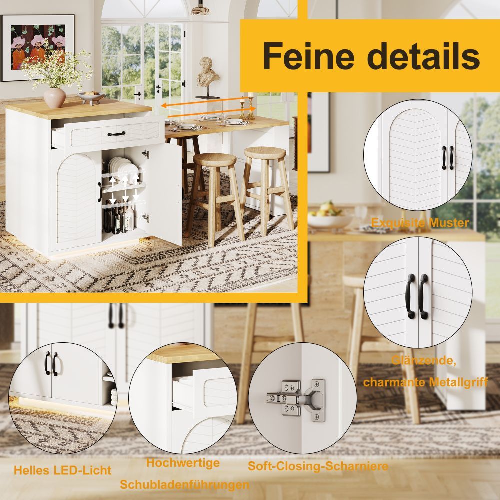 Kücheninsel und Küchenschrank aus MDF und Metall mit modernem Design. Der ausziehbare Tisch ermöglicht eine flexible Nutzung im Küchen- und Essbereich. Mit 2 Schubladen und 4 Türen bietet das Modell praktischen Stauraum für Geschirr, Küchenhelfer und Vorräte. Ideal als Bartischschrank oder feststehender Servierwagen.