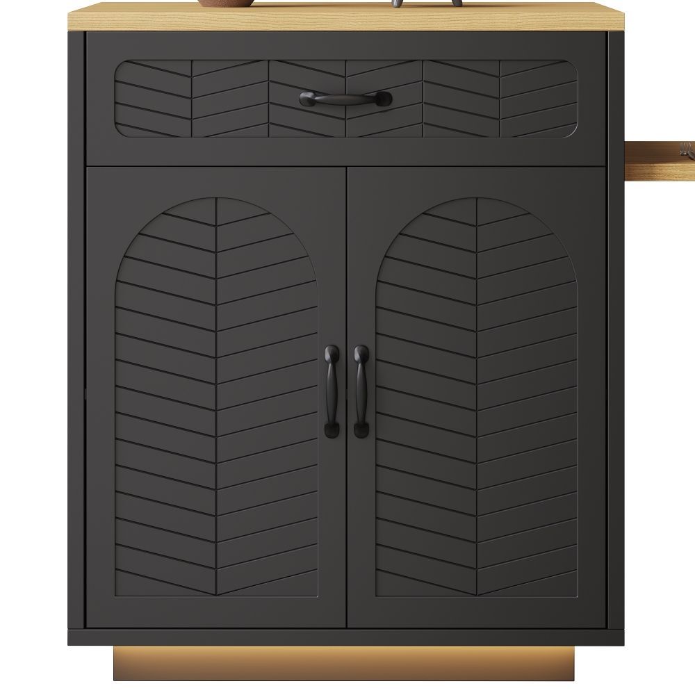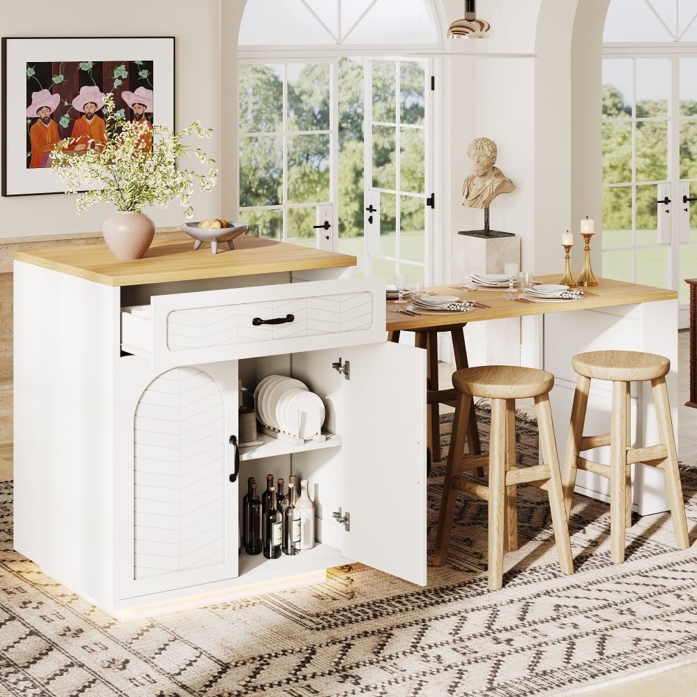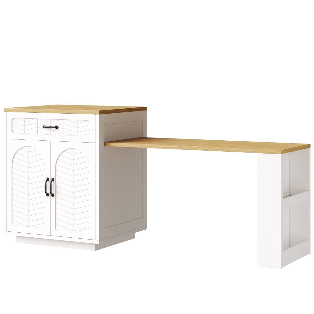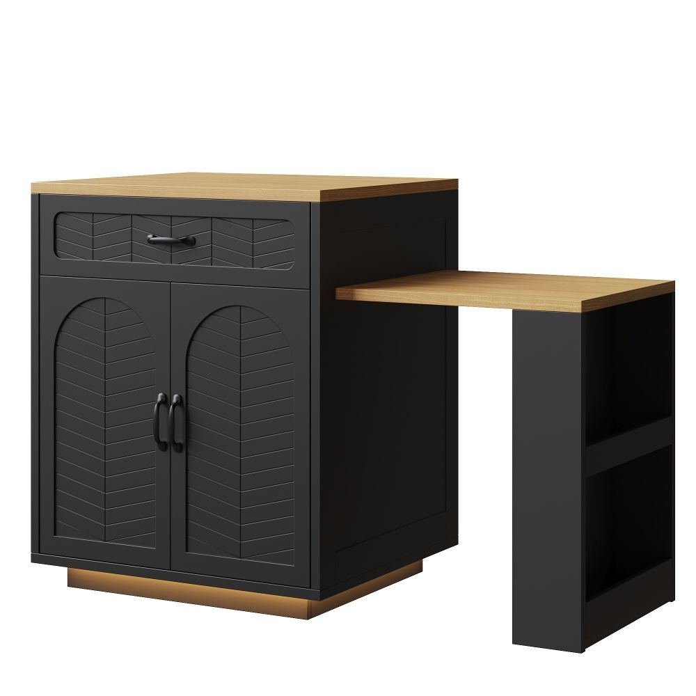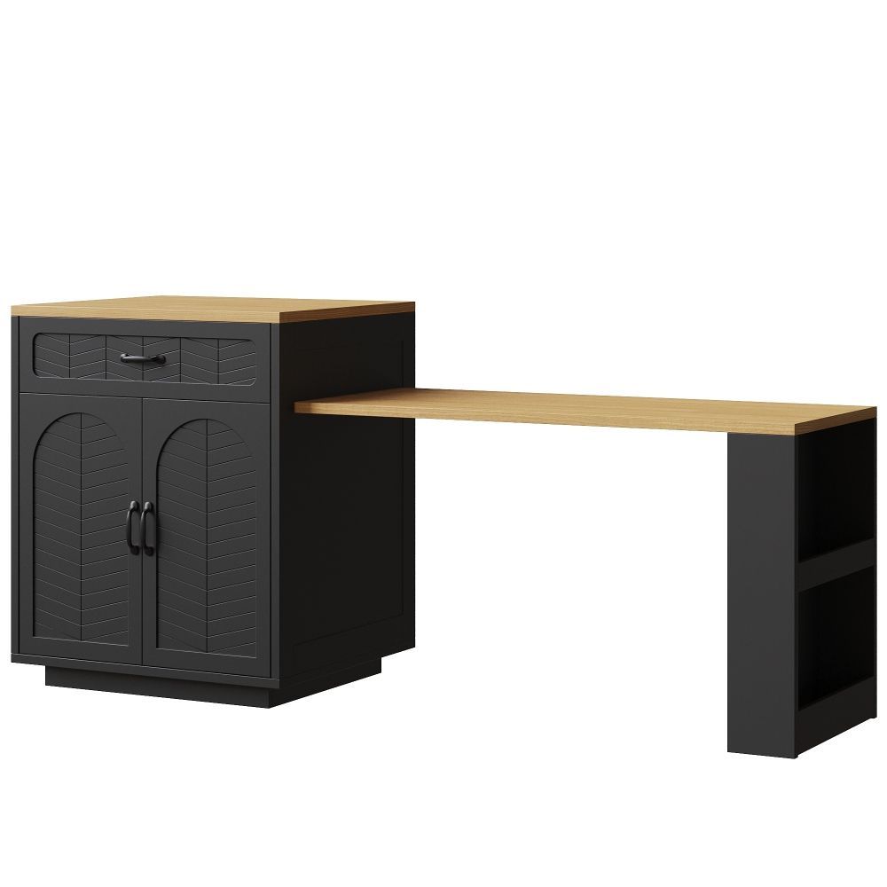 Kücheninsel und Küchenschrank aus MDF und Metall mit modernem Design. Der ausziehbare Tisch ermöglicht eine flexible Nutzung im Küchen- und Essbereich. Mit 2 Schubladen und 4 Türen bietet das Modell praktischen Stauraum für Geschirr, Küchenhelfer und Vorräte. Ideal als Bartischschrank oder feststehender Servierwagen.