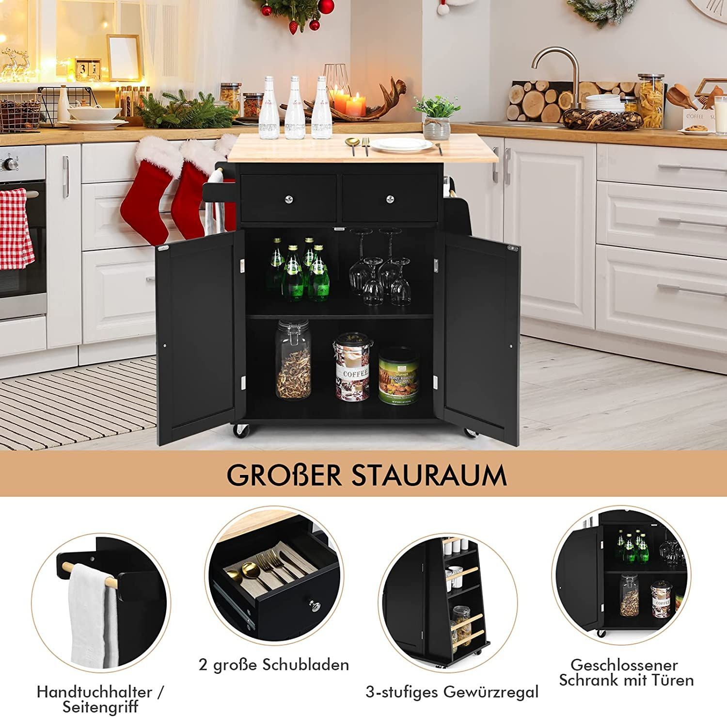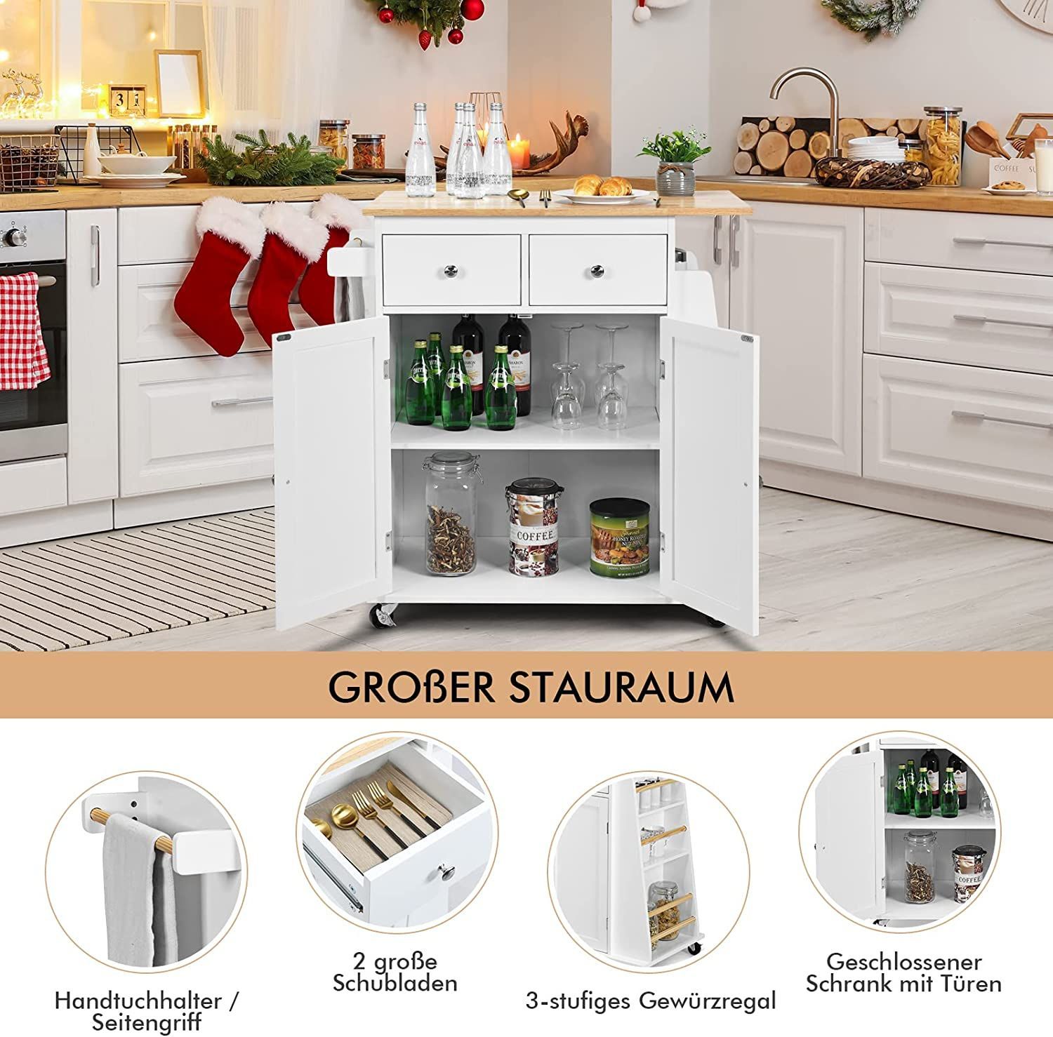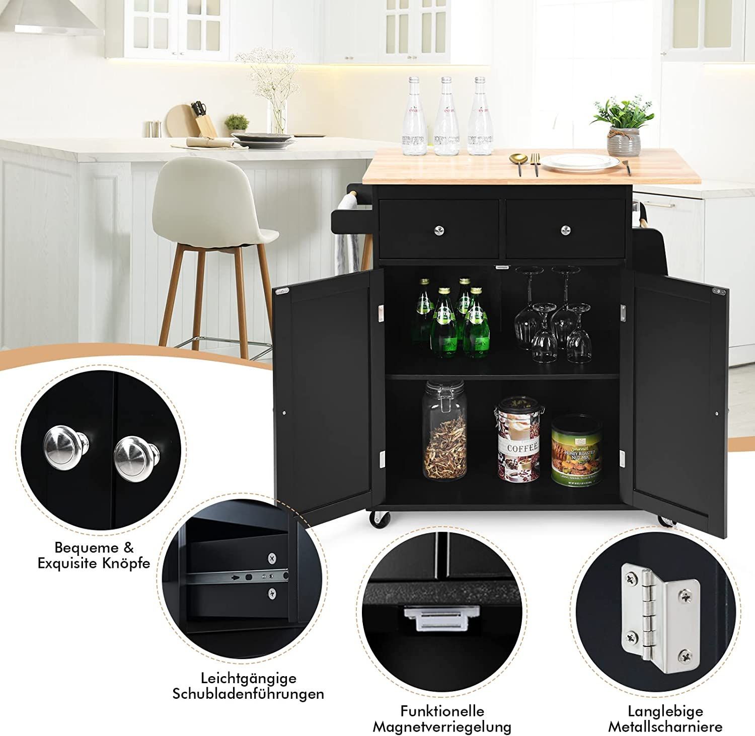 Kücheninsel mit Handtuchhalter, rollender Küchenwagen aus Gummiholz mit 2 Schubladen