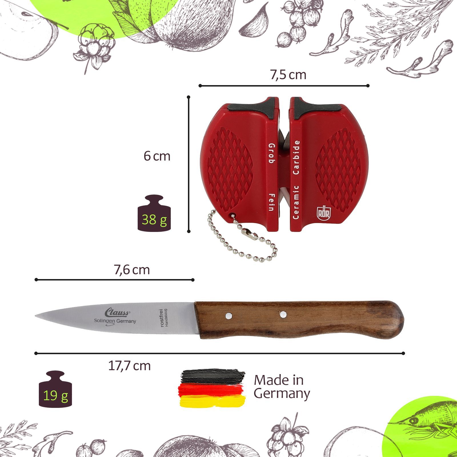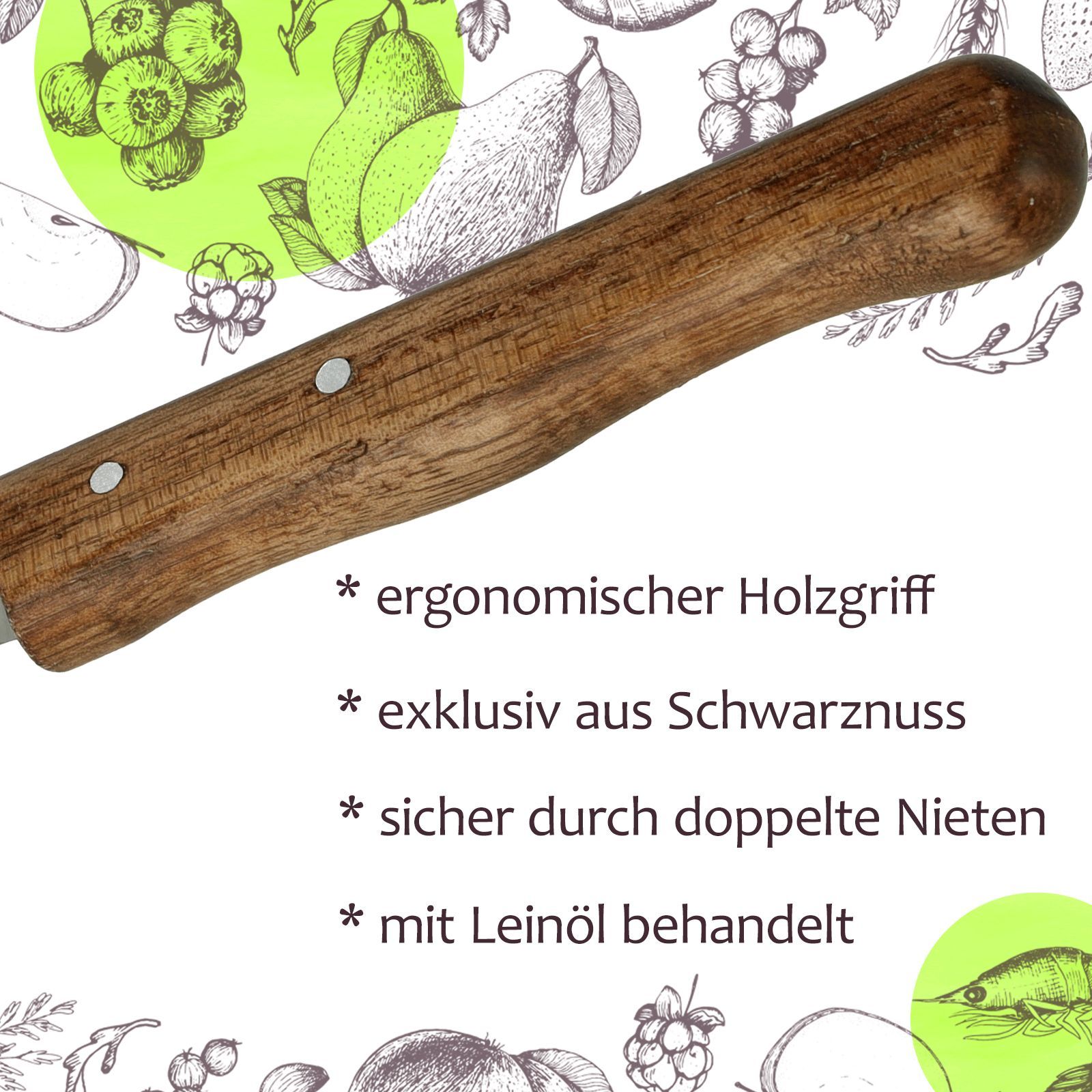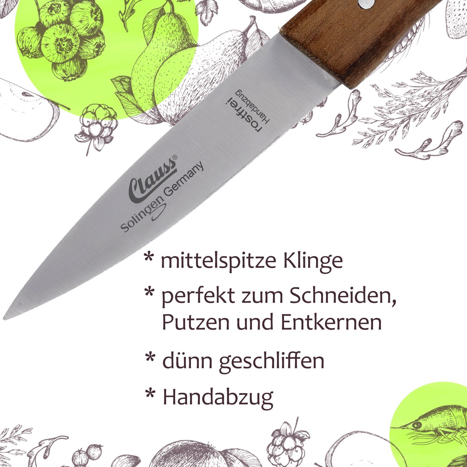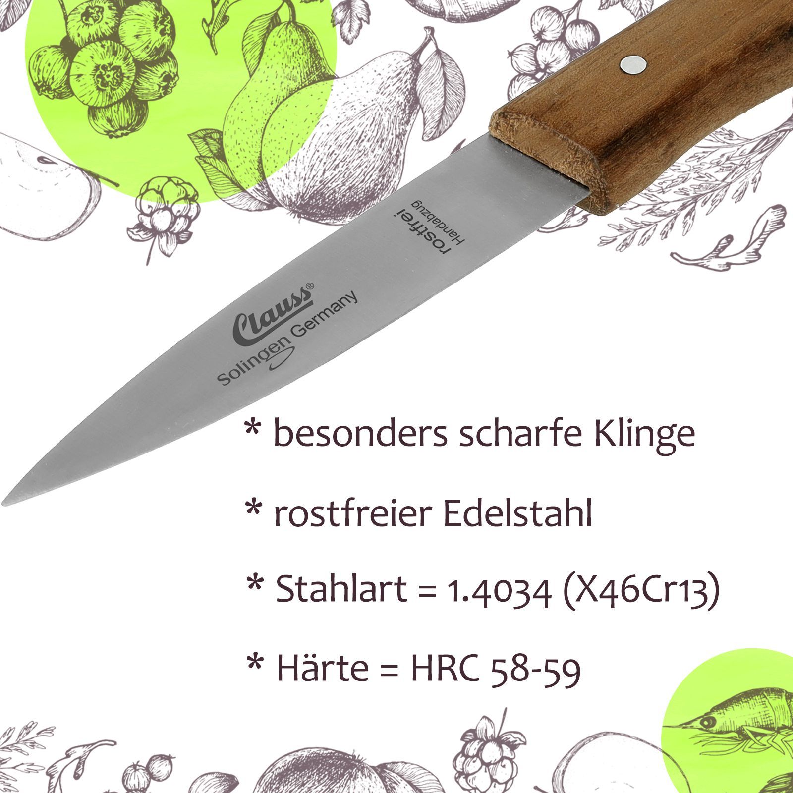 Das original CLAUSS Schälmesser Made in Solingen ist besonders scharf - traditionell sehr dünn geschliffen und fachgerecht von Hand geschärft (Handabzug). Das hochwertige Küchenmesser überzeugt durch seine Qualität, ist schnitthaltig und langlebig. Die Edelstahlklinge aus Spezialstahl ist rostfrei und robust. Jeder der ergonomischen Griffe aus Echtholz ist handverlesen und als Naturprodukt mit einzigartiger Maserung, Farbe und Wuchsrichtung ein Unikat. Der Griff überzeugt als Handsc...