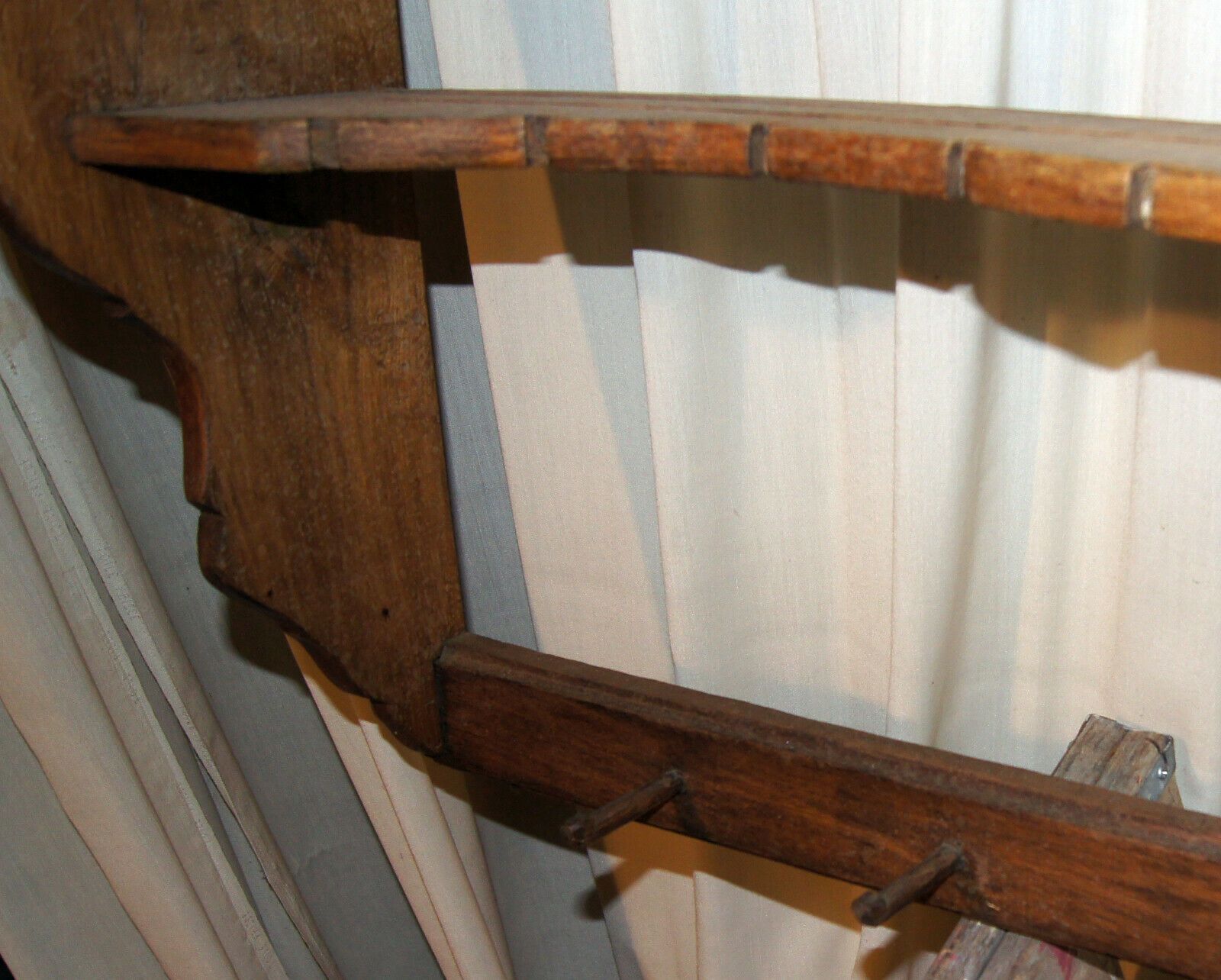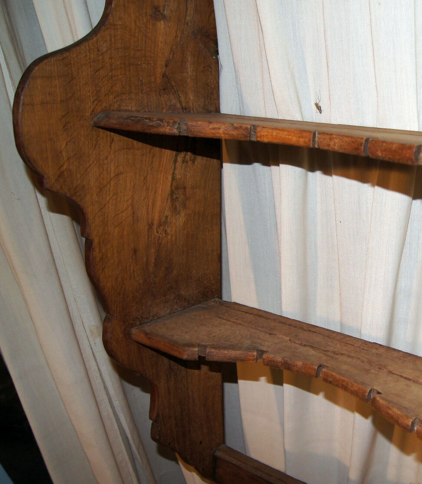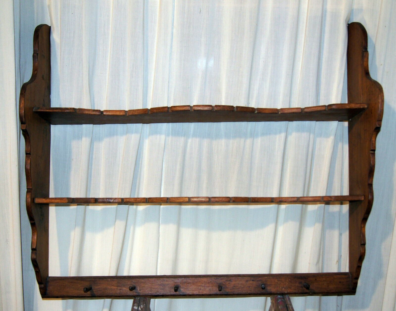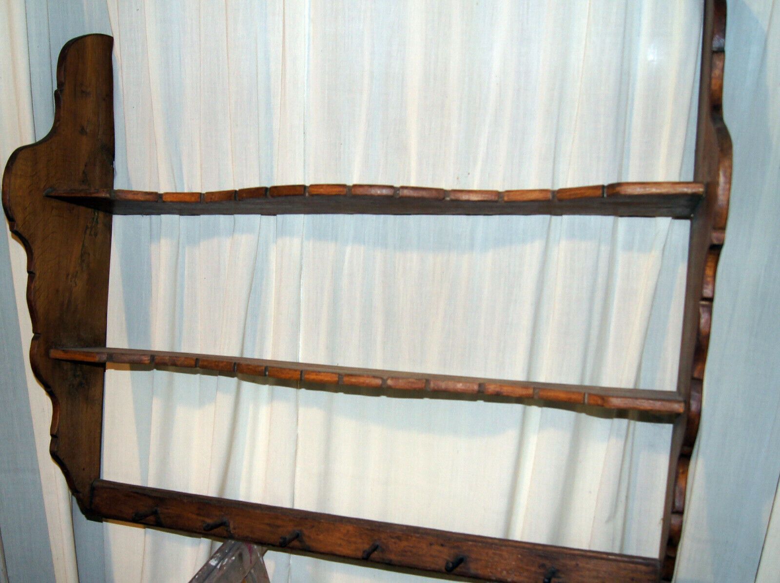 Küchen-Regal Teller-Bord um 1800 (Barock). Herkunft: Deutschland. Material: Eiche mittel. Feste Regalböden mit Tellerrillen, 24 Löffelstellen und 6 Kellenhaken. Recht gut erhalten. Maße: H 92, B 104, T 29 cm. Lieferung im Umkreis von 40 km frei Haus! Sonst Transport mit Spedition möglich (je nach An