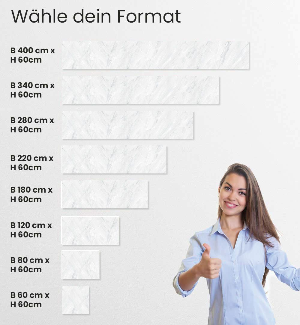 60 x 60cm, 80 x 60cm, 120 x 60cm, 180 x 60cm, 220 x 60cm, 280 x 60cm, 340 x 60cm und 400 x 60cm