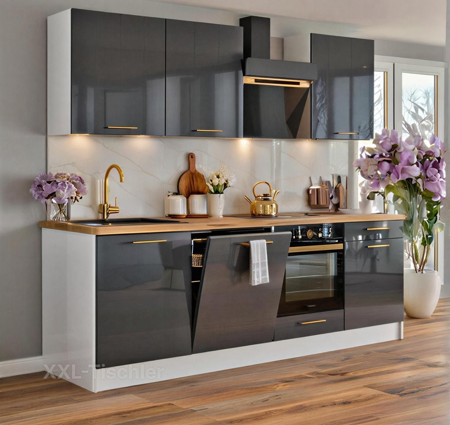 Küchenzeile Axis 240 cm DW Grau Hochglanz/Weiß Matt- Küche, Küchenblock 2,4m