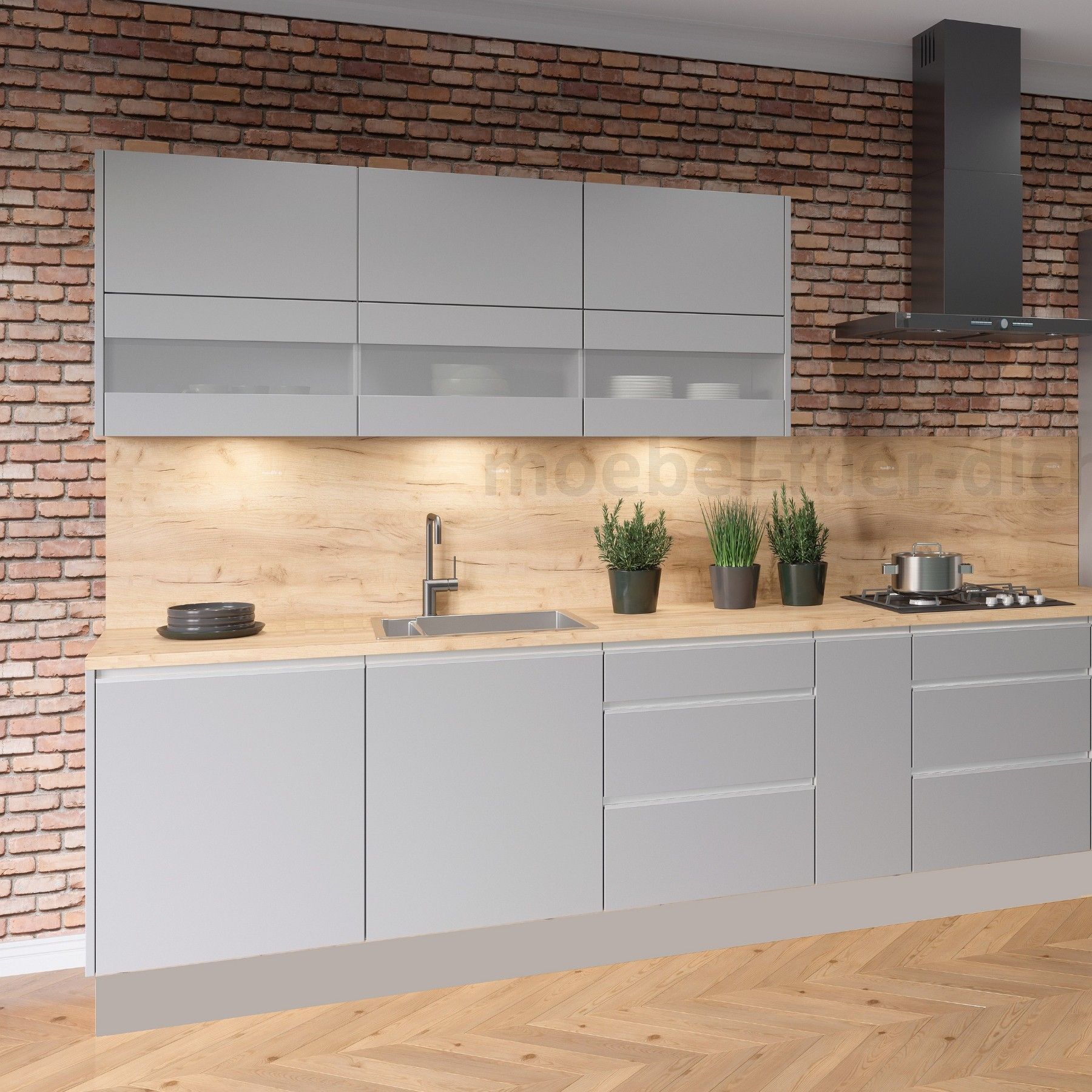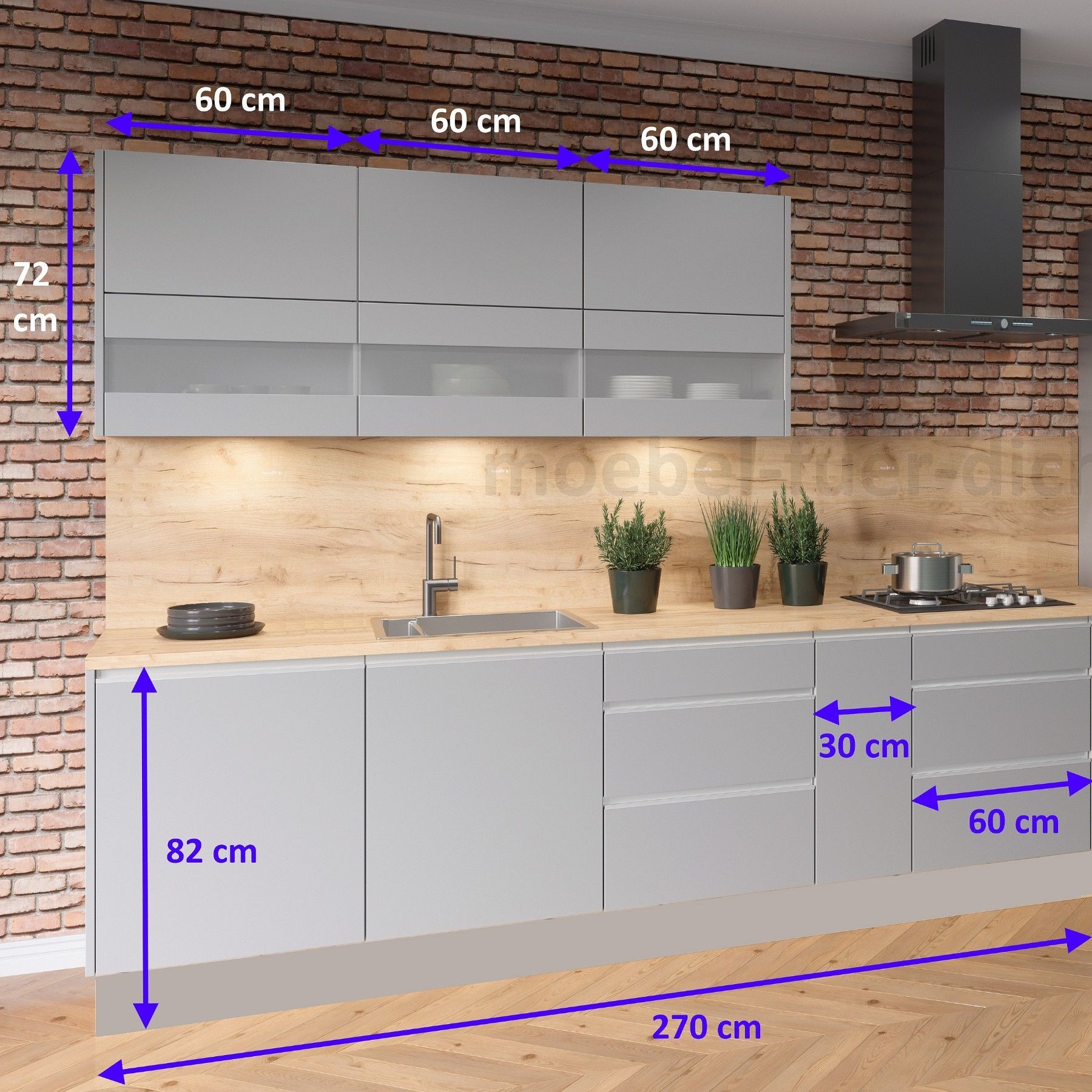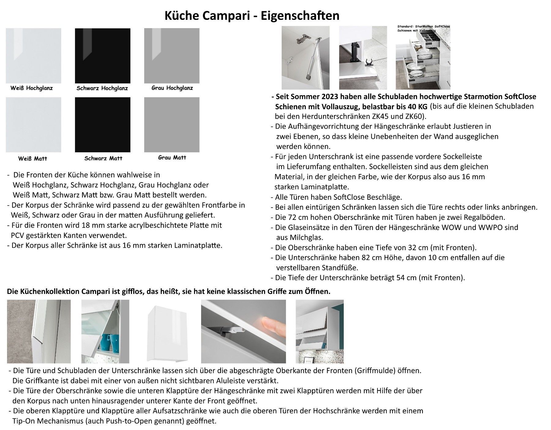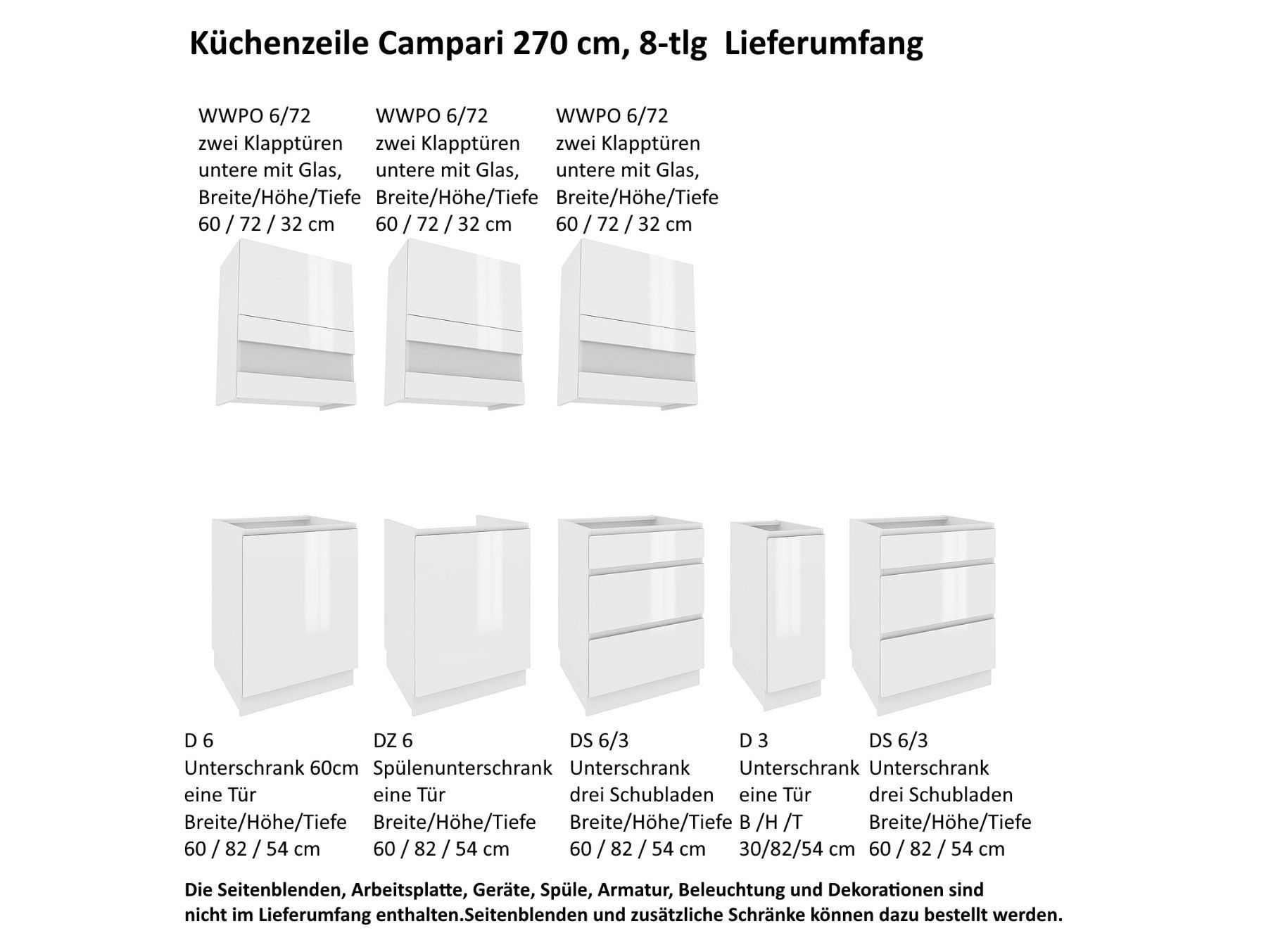 Küchenzeile Einbauküche Campari 270 cm 8-tlg, grifflos, Hochglanz Grau, Weiß, Schwarz