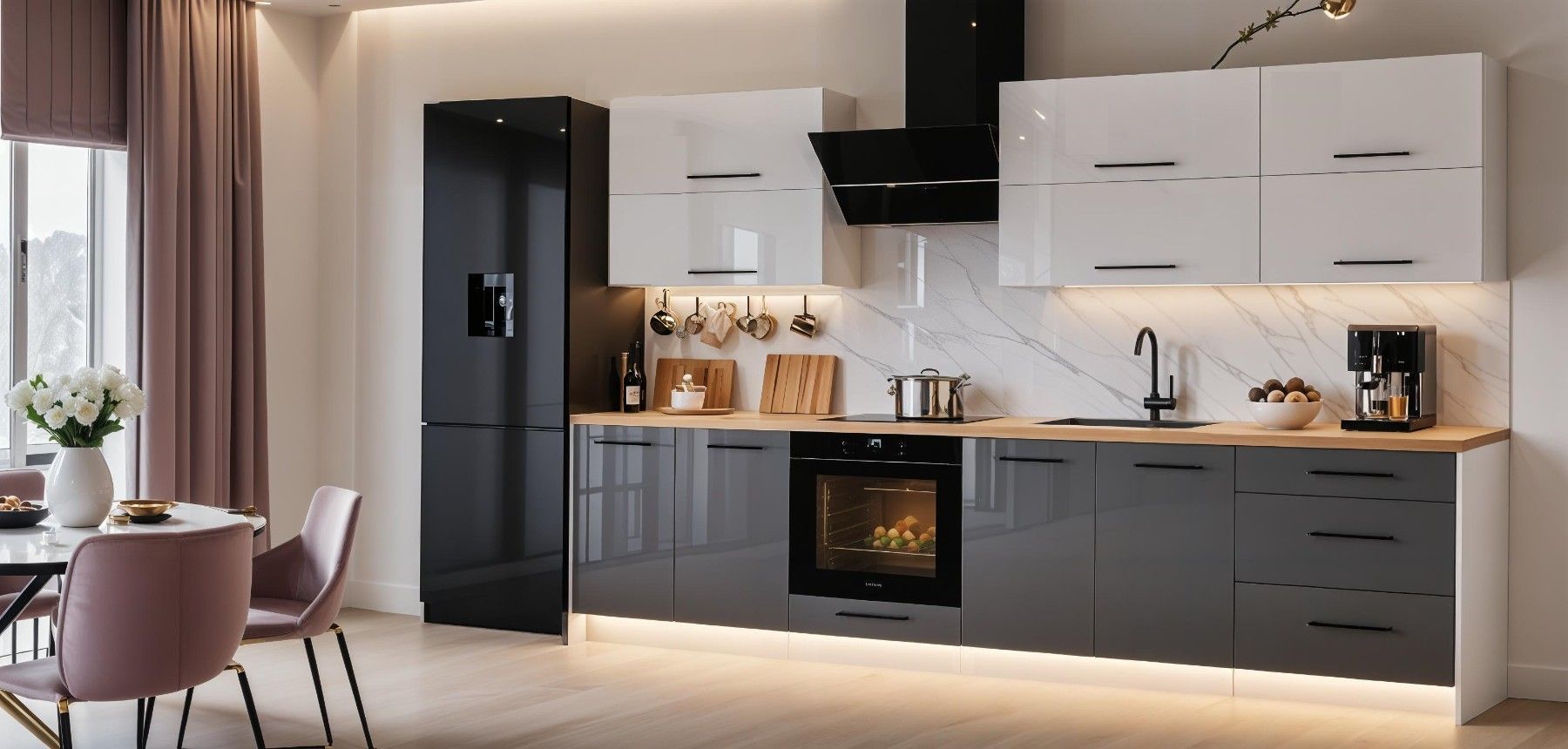 Küchenzeile EMMA 280 cm-Grau Hochglanz-ABS Kanten-MDF-VOLLAUSZUG-Einbauküche 2,8m
