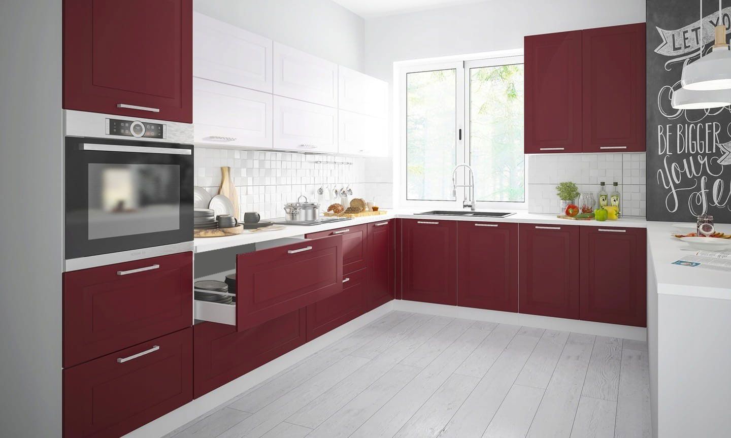 Küchenzeile L-Form Küchenblock "Rimini" 325x223cm grau signalweiß - purpurrot Matt la
